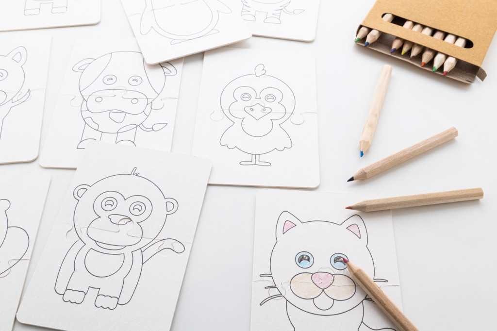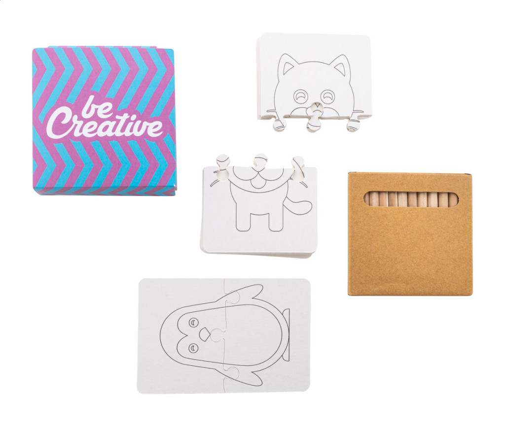 Egyedi gyártású, színezős karton puzzle készlet full colour nyomtatott papírdobozban. Fa színesceruzákkal (12 db) és 9 db kétrészes, állatos tematikájú puzzle kártyával. Minimális rendelési mennyiség: 100 db. Teljes felület