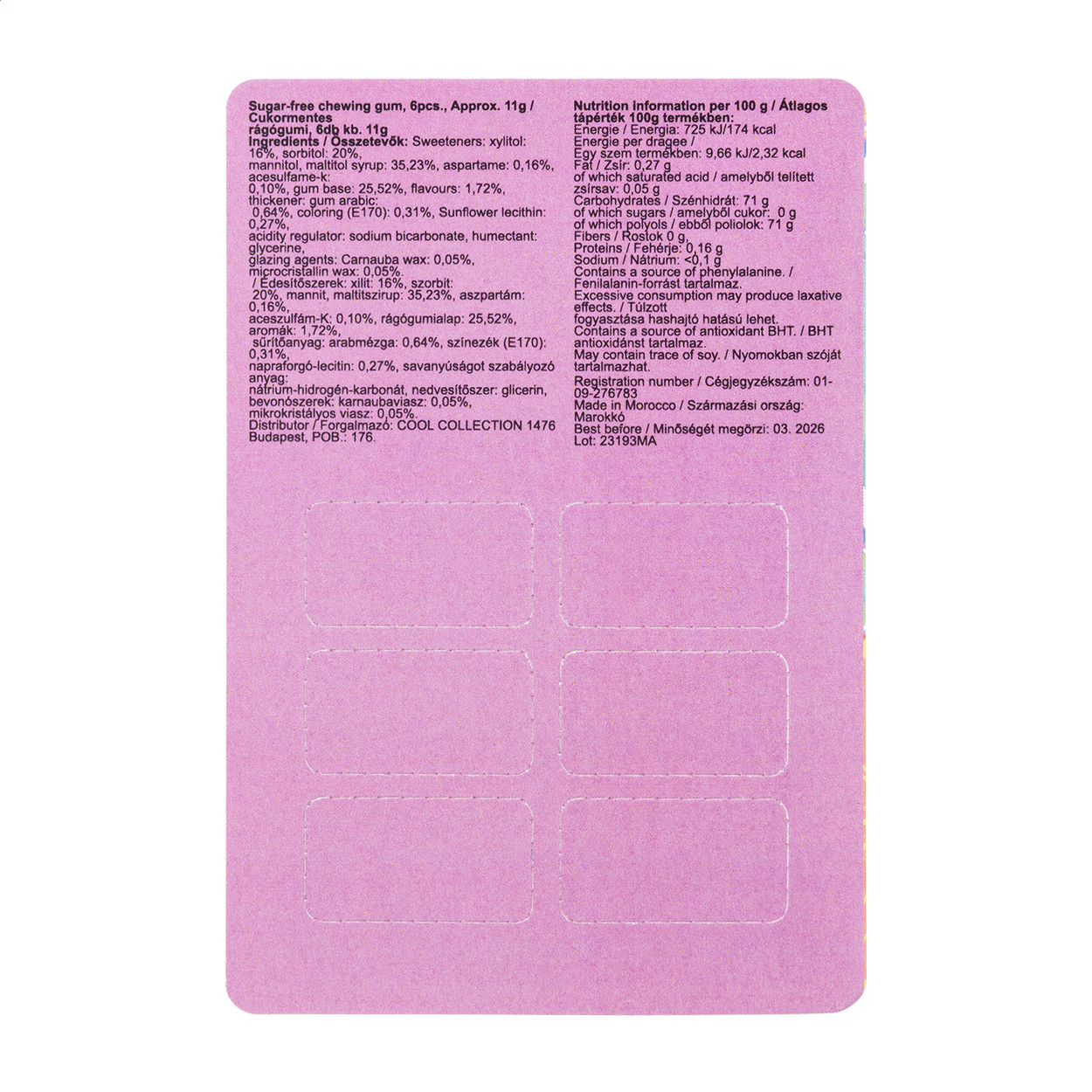 6 db cukormentes rágógumi bliszterben, egyedi gyártású, full-colour nyomtatott perforált papírborítással. Minimális rendelési mennyiség: 100 db.