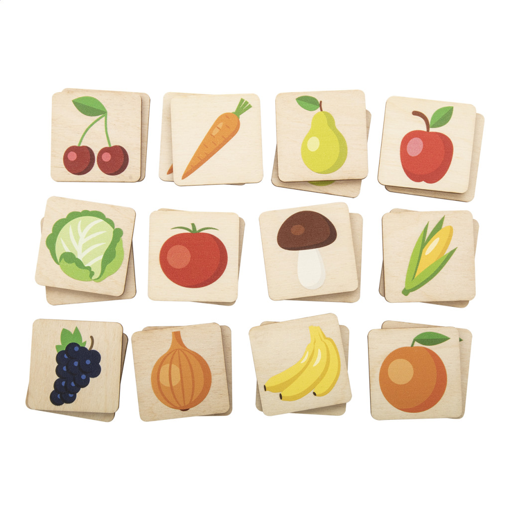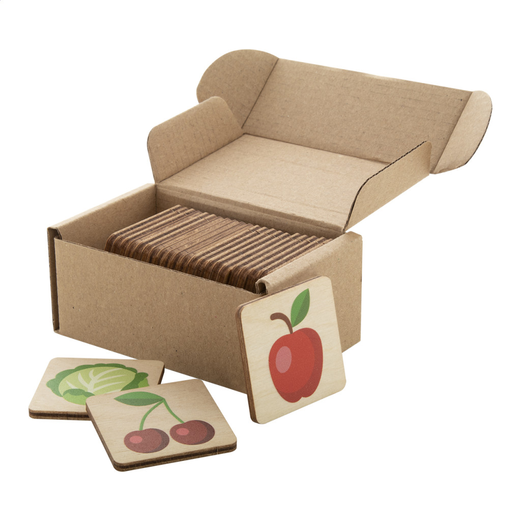 Rétegelt nyírfából készült memóriajáték tematikus figurákkal. 24 lapka (40×40 mm). Az ár tartalmazza az emblémázás költségét, 1 színnel nyomva az összes lapka hátoldalán. Minimális rendelési mennyiség: 50 db. Hátulja