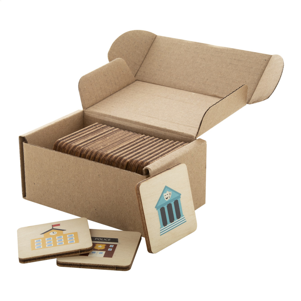 Rétegelt nyírfából készült memóriajáték tematikus figurákkal. 24 lapka (40×40 mm). Az ár tartalmazza az emblémázás költségét, 1 színnel nyomva az összes lapka hátoldalán. Minimális rendelési mennyiség: 50 db. Hátulja