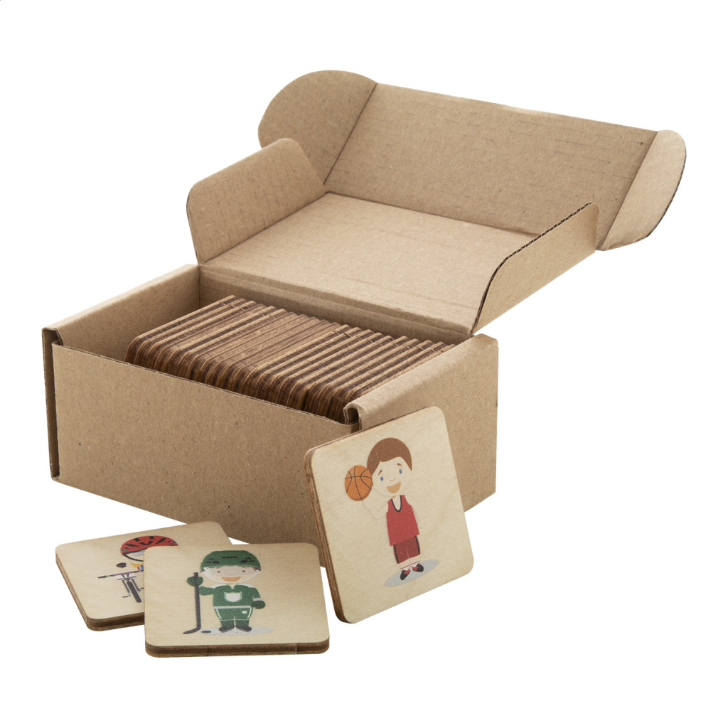 Rétegelt nyírfából készült memóriajáték tematikus figurákkal. 24 lapka (40×40 mm). Az ár tartalmazza az emblémázás költségét, 1 színnel nyomva az összes lapka hátoldalán. Minimális rendelési mennyiség: 50 db. Hátulja