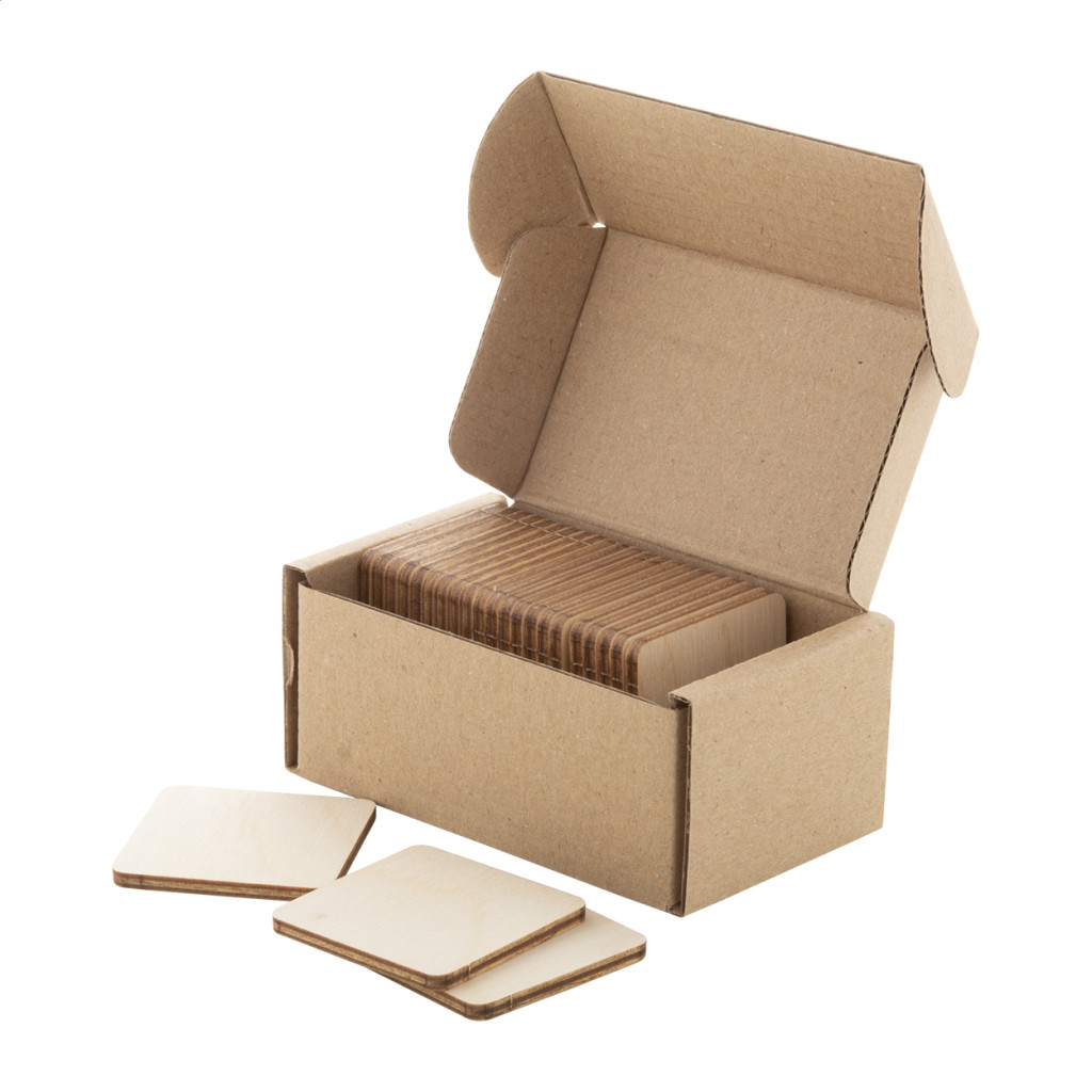 Rétegelt nyírfából készült memóriajáték egyedi grafikával. 24 lapka (40×40 mm). Az ár tartalmaz 12 különböző motívum színes nyomtatását a lapkák elülső oldalán és logó nyomtatást 1 színnel a lapok hátoldalán. Minimum rendelési mennyiség: 250 db. Eleje