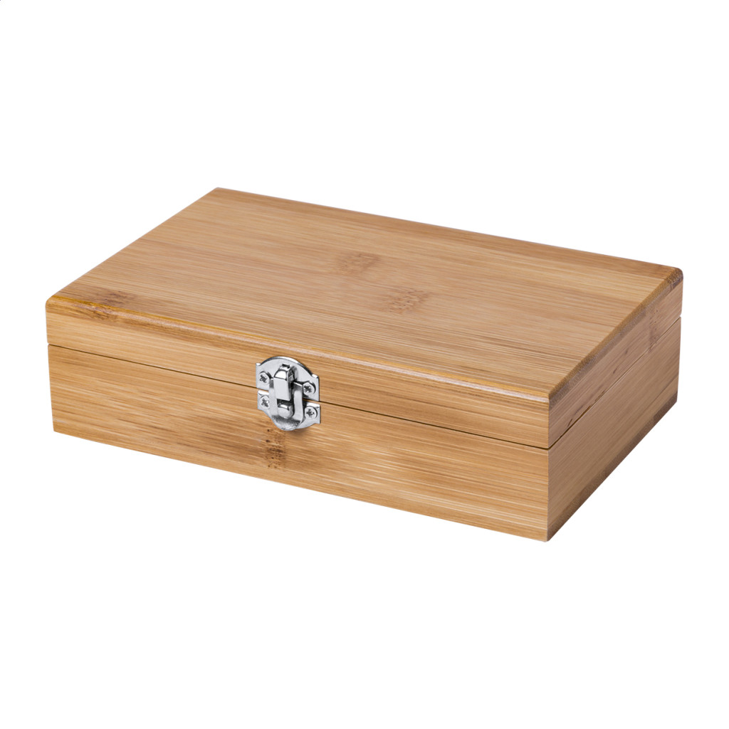 Bambusz boros szett dugóhúzóval, cseppőrrel és záródugóval bambusz dobozban. Doboz - teteje