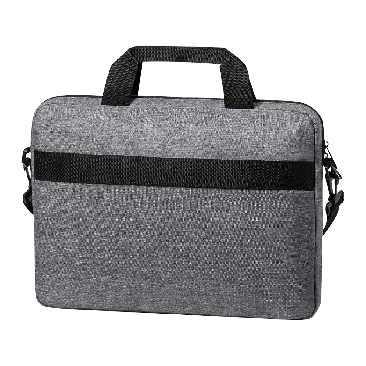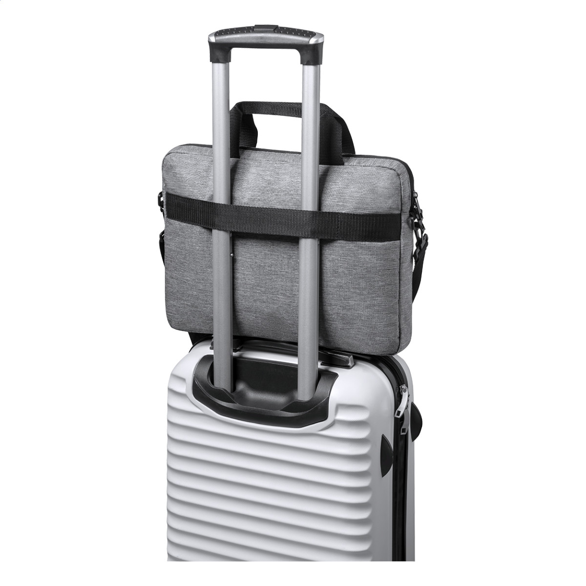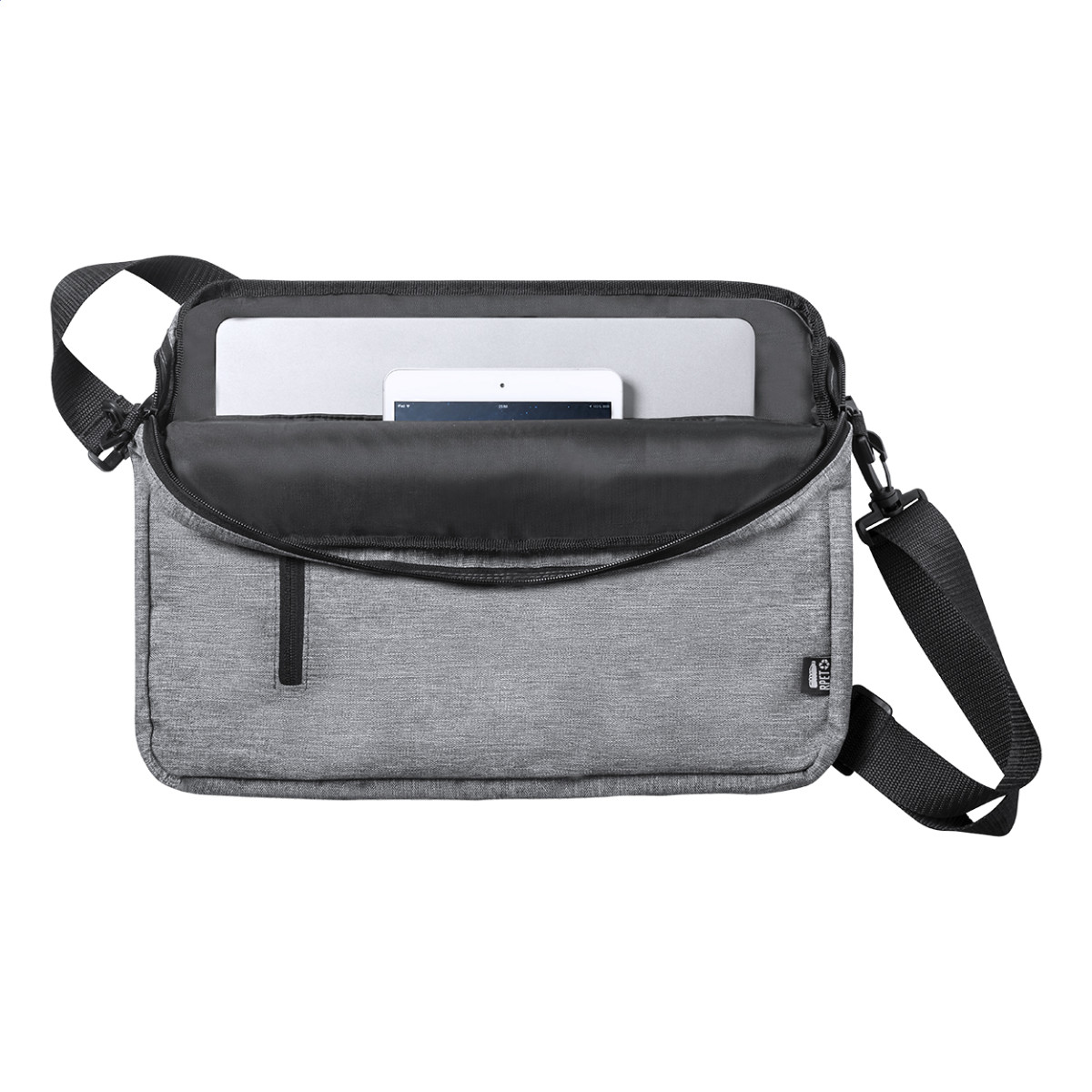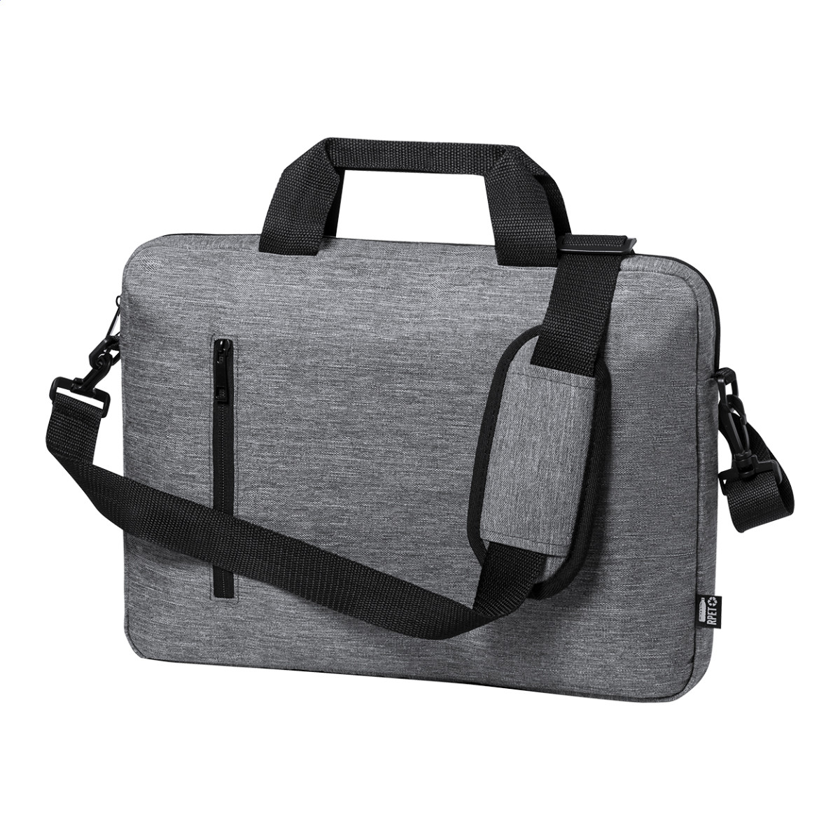 RPET, cipzáras irattáska állítható vállpánttal, pánttal bőröndre rögzítéshez és párnázott laptoptartó (15") és tablettartó (10") rekesszel. 600D RPET poliészter. Jobb oldal