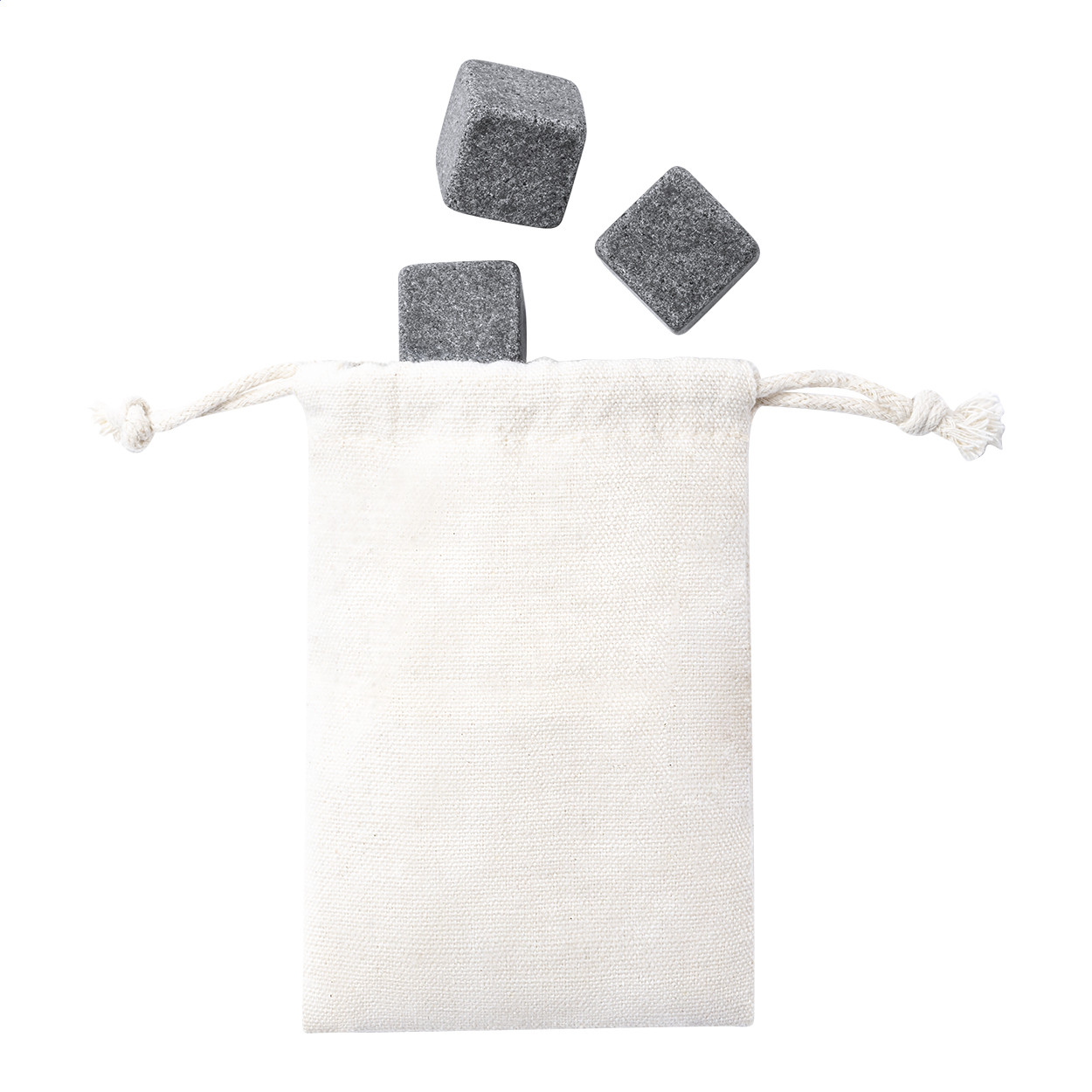 4 darabos újrahasználható, kő jégkocka szett pamut tasakban. Tok eleje