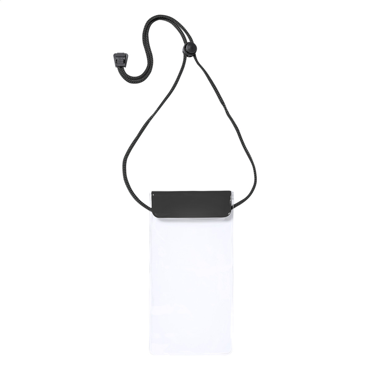 PVC-ből készült, vízálló telefontok hozzáillő színű nyakpánttal. Legfejebb 6.5" méretű, érintőképernyős telefonokhoz alkalmas. Eleje