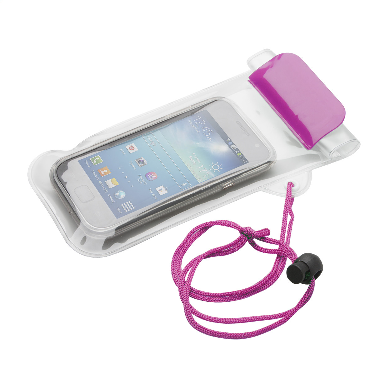 Vízálló, műanyag tasak, színes nyakba akasztó madzaggal. Teteje