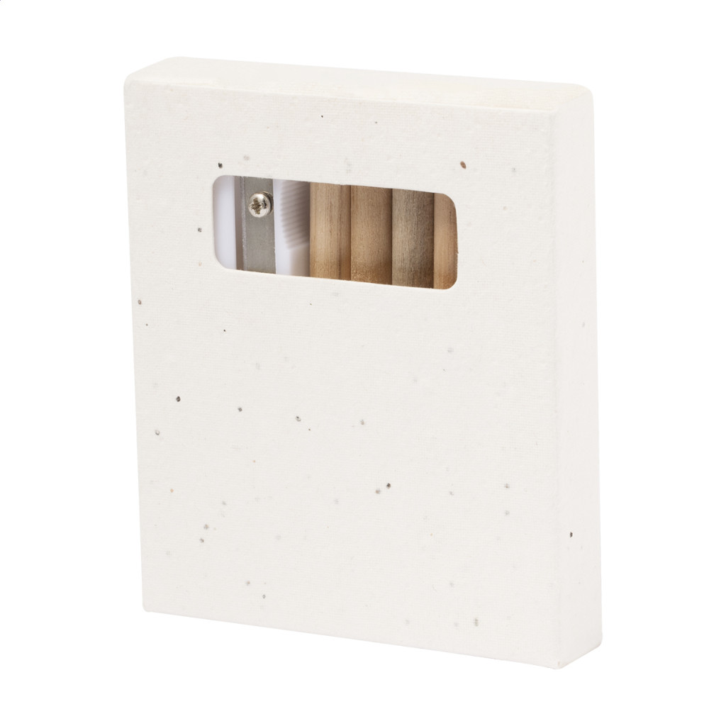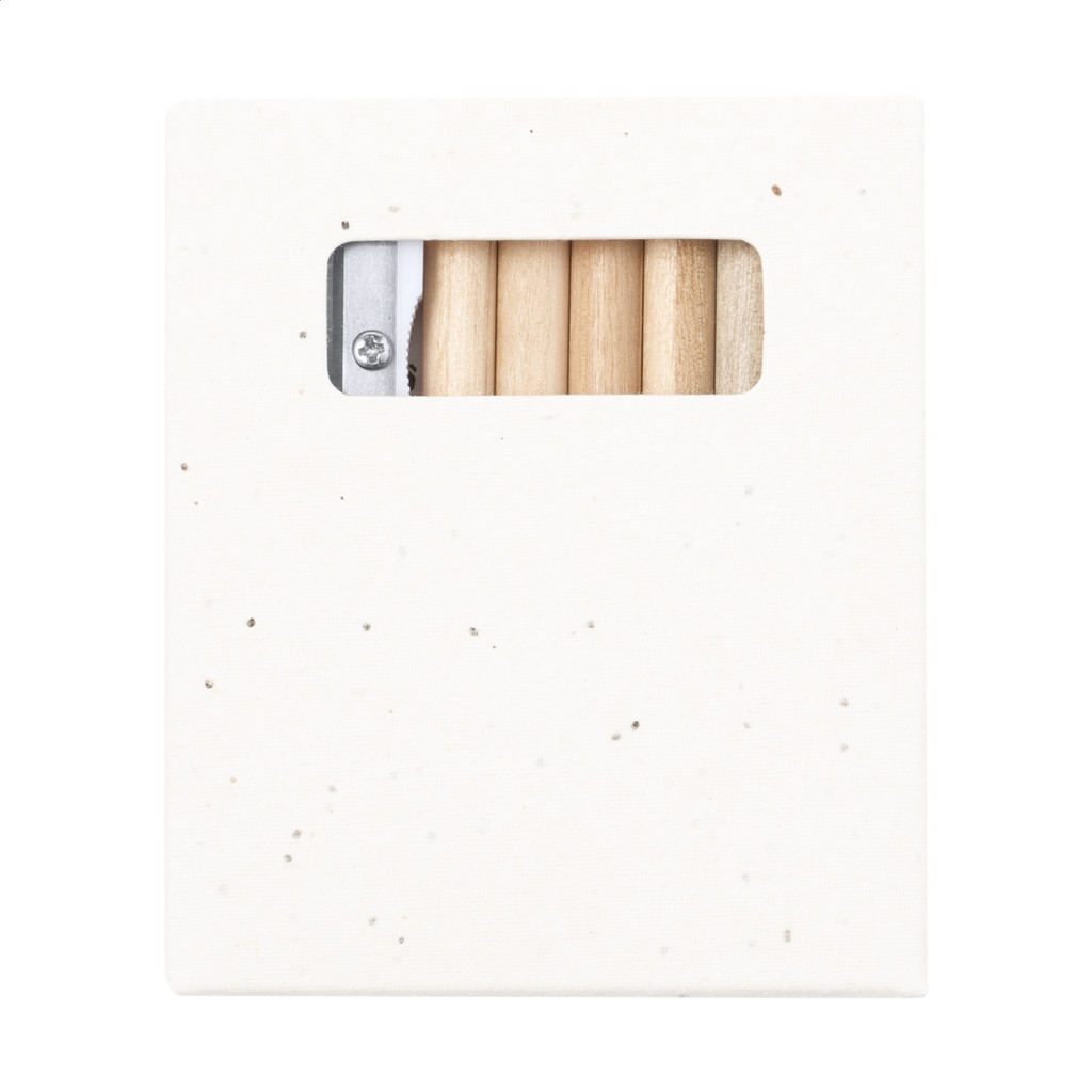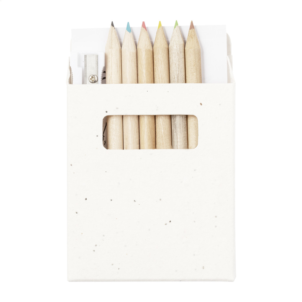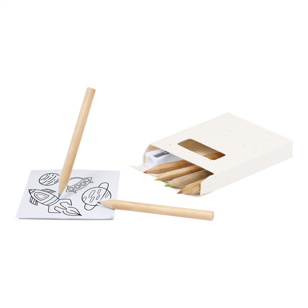 Színező készlet magpapípr dobozban. 6 db színes fa ceruzával, hegyezővel és 20 lapos színező füzettel. A magpapír doboz petúnia magokat tartalmaz válogatott színekben, melyek használat után elültethetők. |