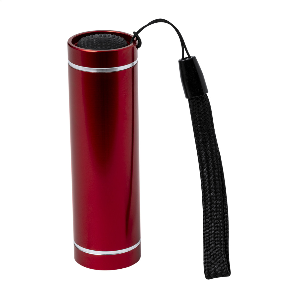 Újrahasznosított alumínium zseblámpa 1 LED-del és hordszíjjal. 3 db AAA elemmel működik, elem nélkül szállítjuk. Jobb oldal
