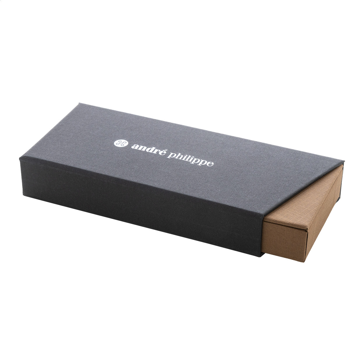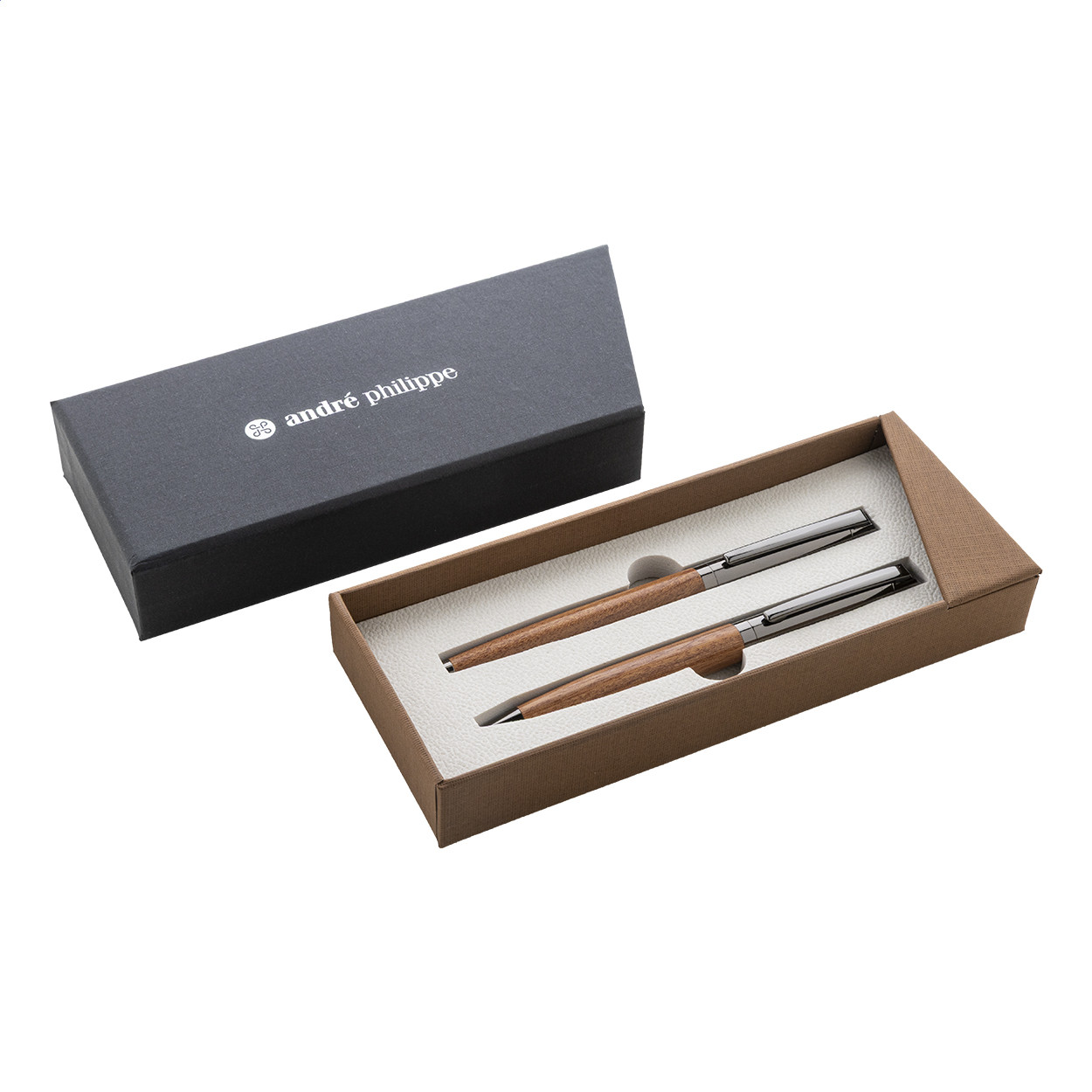 Elegáns, fém golyóstoll és rollertoll szett fa testtel és fényes fegyverfém részletekkel. Kéttónusú ajándékdobozban, kék tollbetéttel. André Philippe márkatermék. Golyóstoll klipsz alatt - jobbkezes