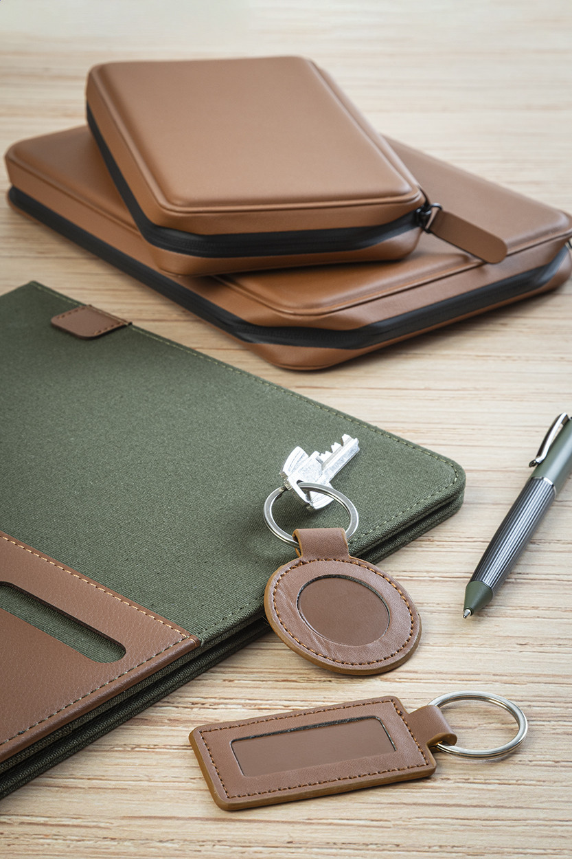 Kör alakú, újrahasznosított PU bőr kulcstartó fém karikával és gumírozott rozsdamentes acél logóval. Speciális bevonattal a tükörlézeres gravírozáshoz. |