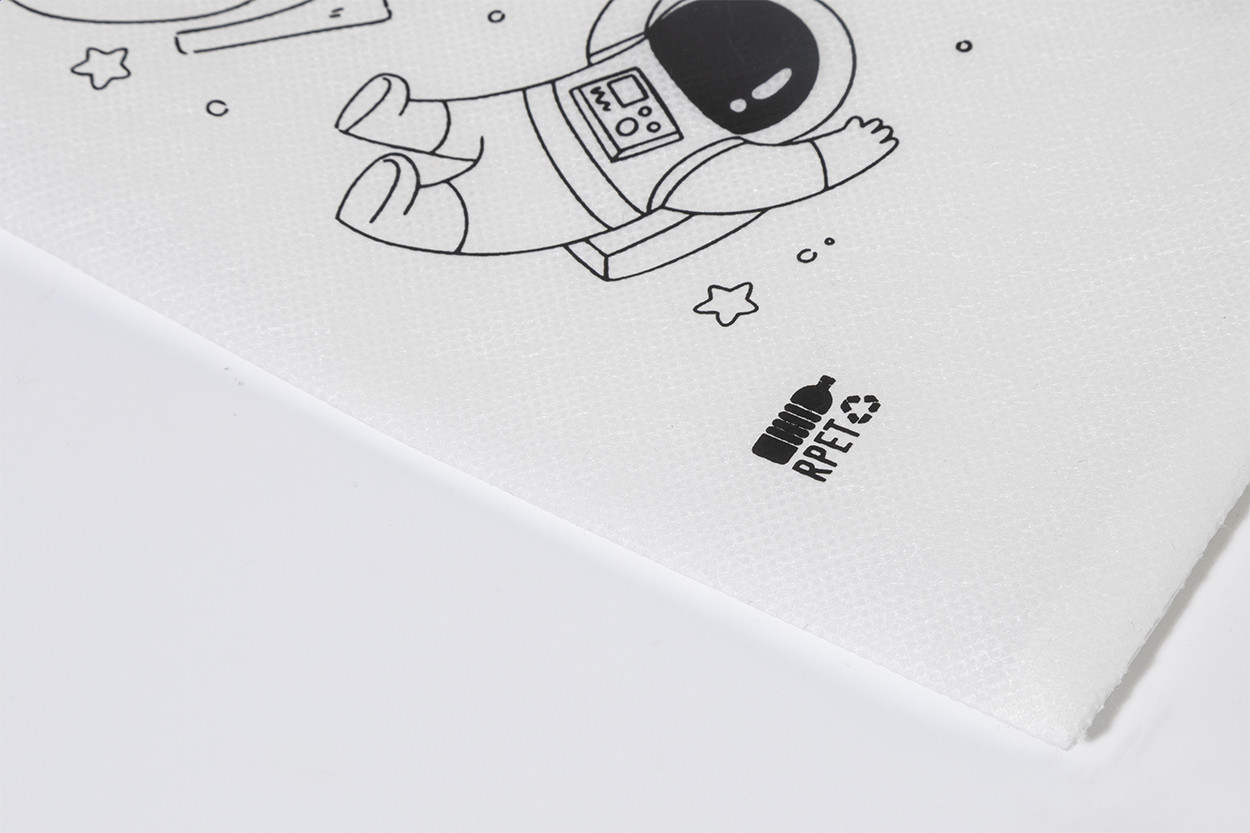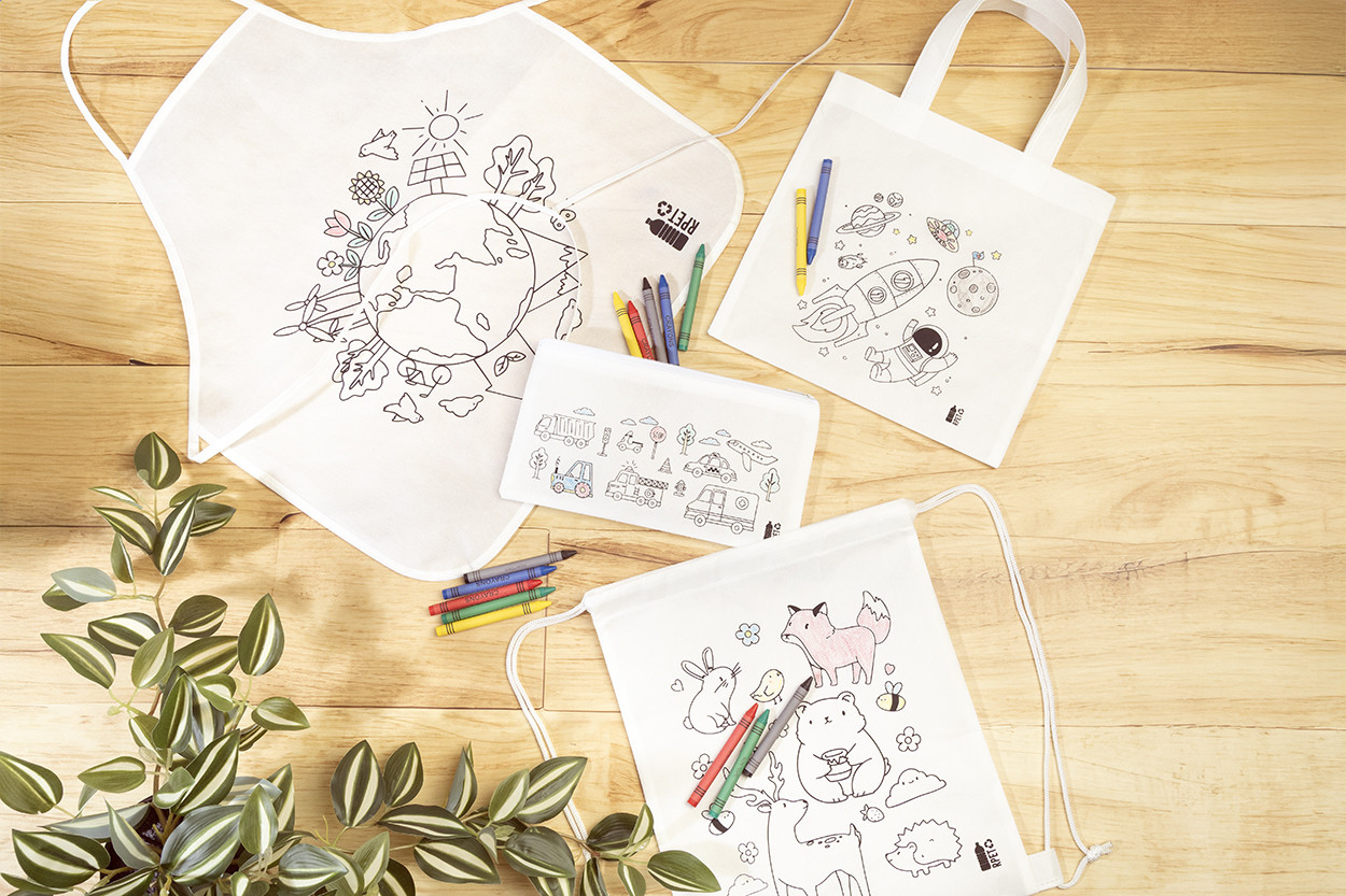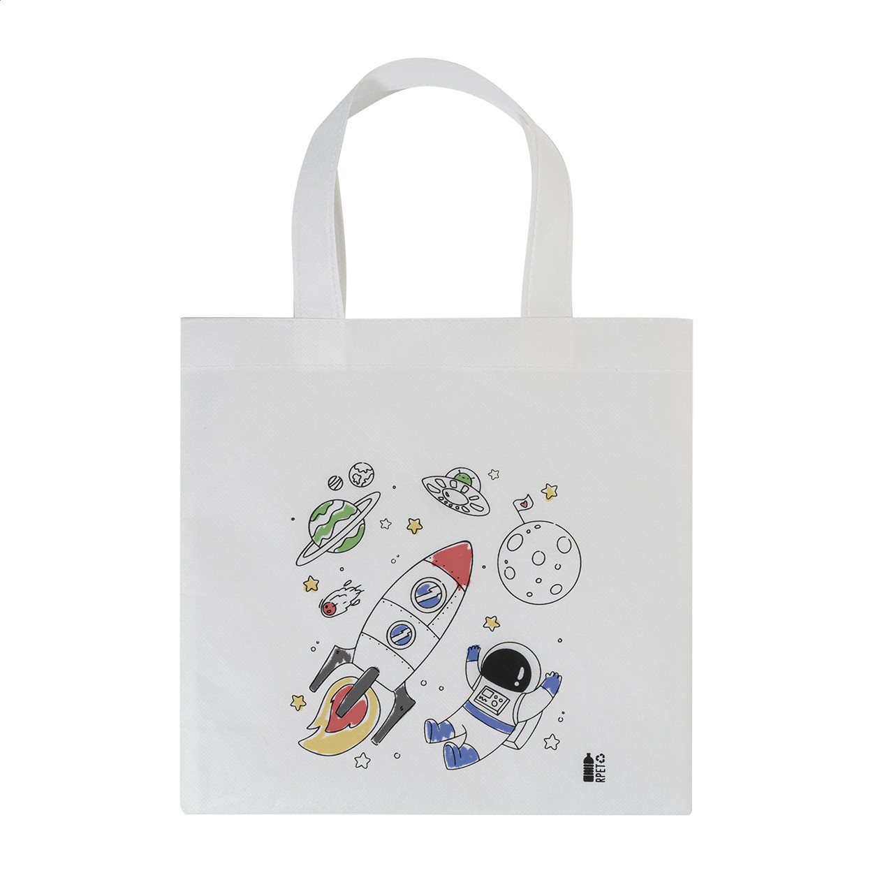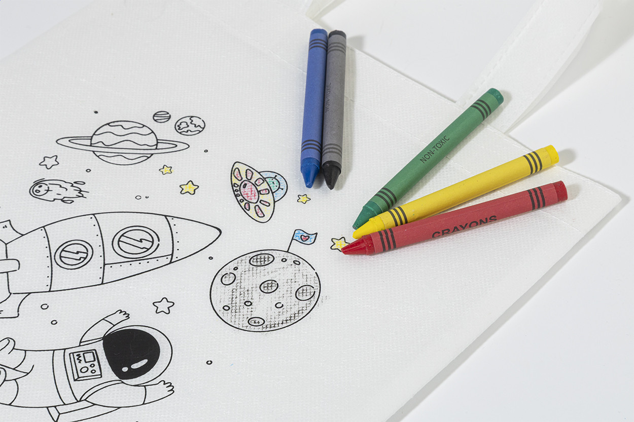 RPET non-woven anyagú, színezhető mini bevásárlótáska gyerekeknek 5 zsírkrétával. Teteje