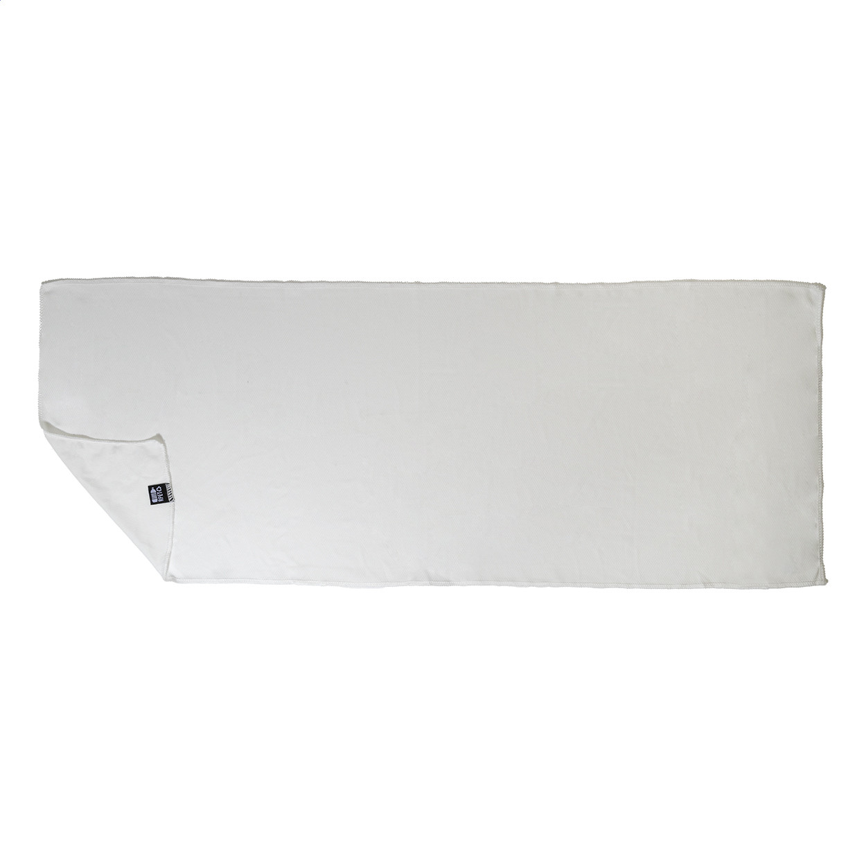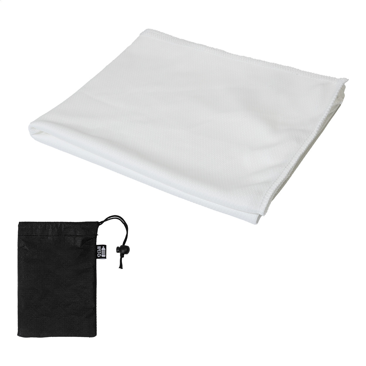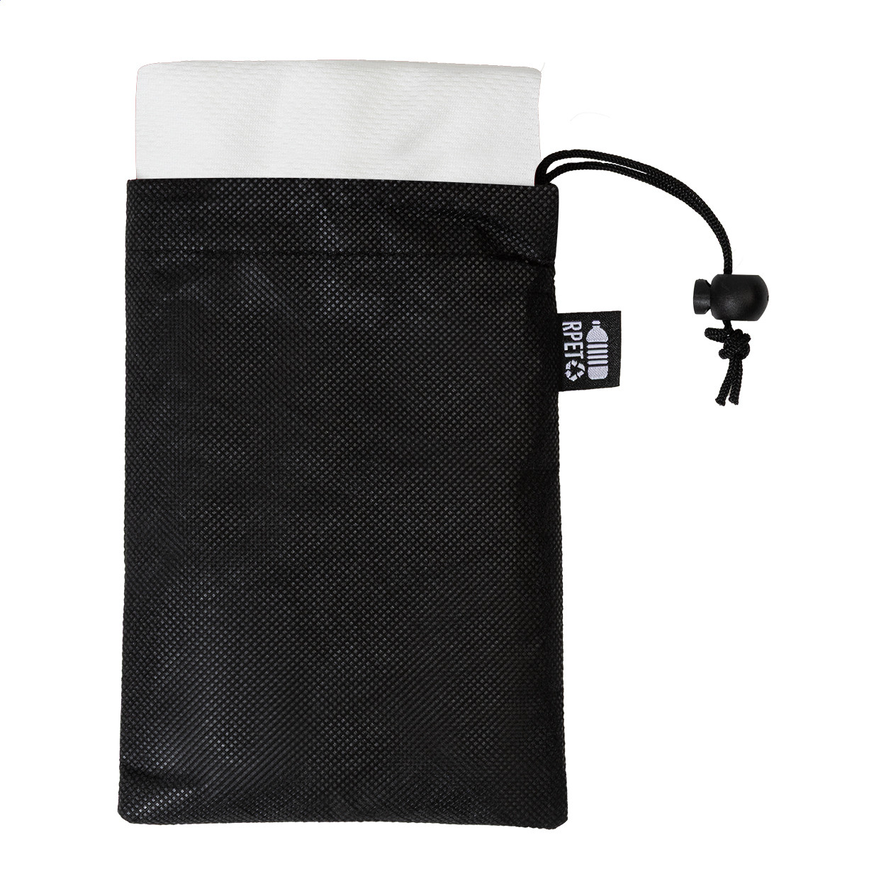 RPET mikroszálas sporttörölköző RPET non-woven hordtáskában, megkülönböztető RPET címkével. RPET poliészter, 140 g/m². Jobb alsó sarok