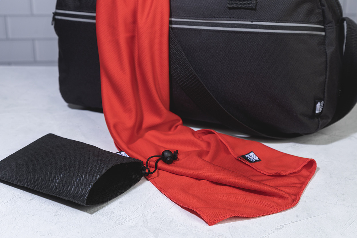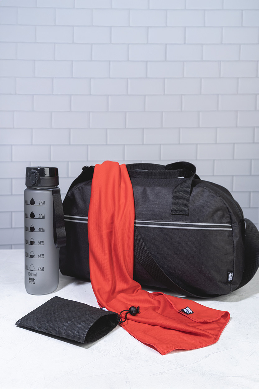 RPET mikroszálas sporttörölköző RPET non-woven hordtáskában, megkülönböztető RPET címkével. RPET poliészter, 140 g/m². Jobb alsó sarok