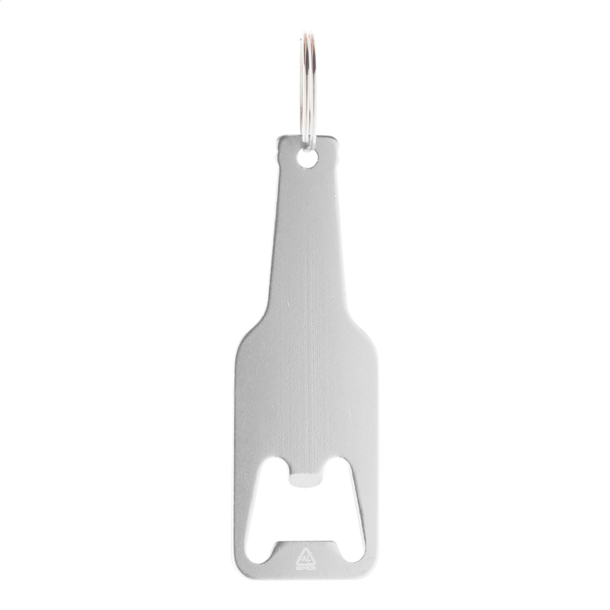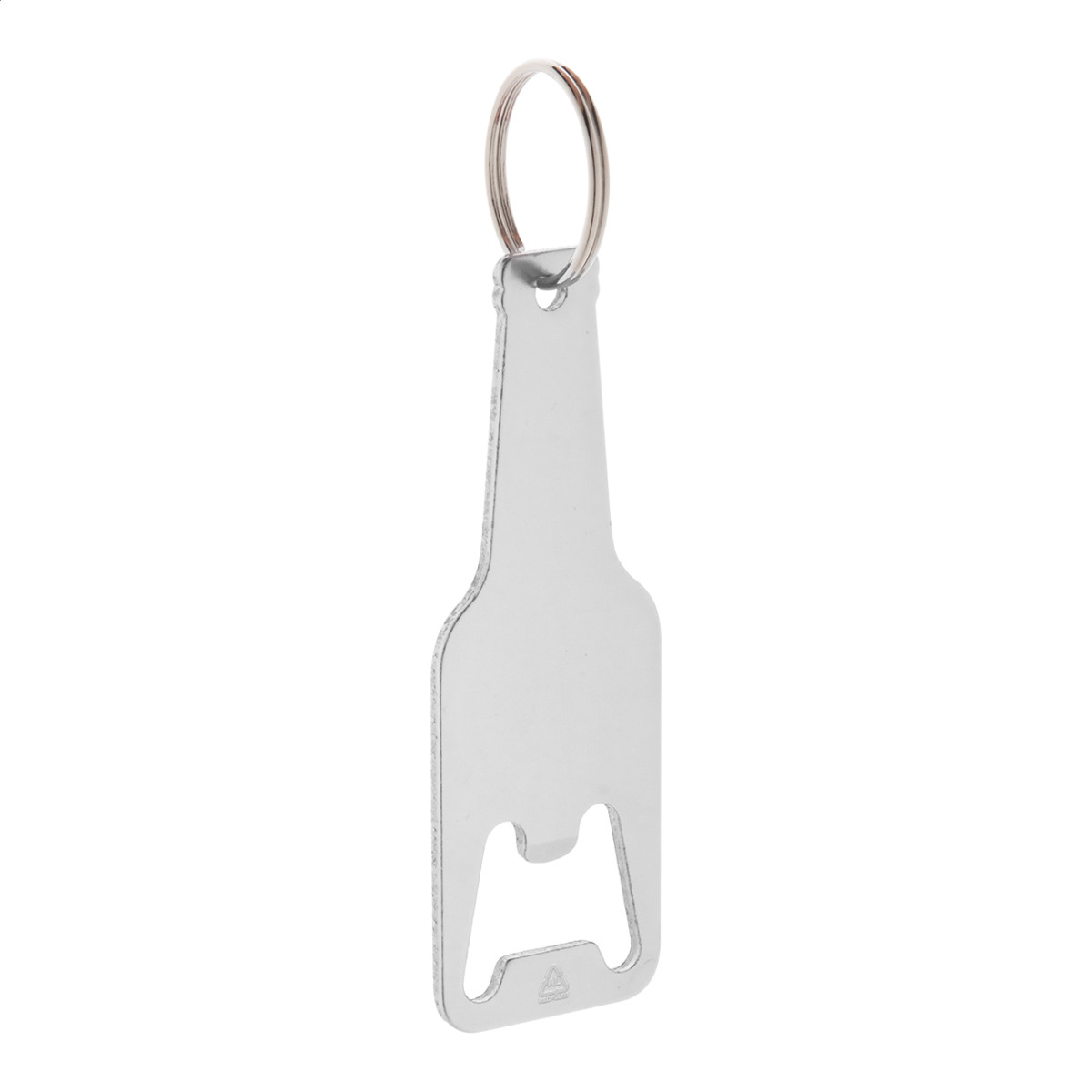 Palack formájú, újrahasznosított alumínium üvegnyitó fém karikával. Eleje