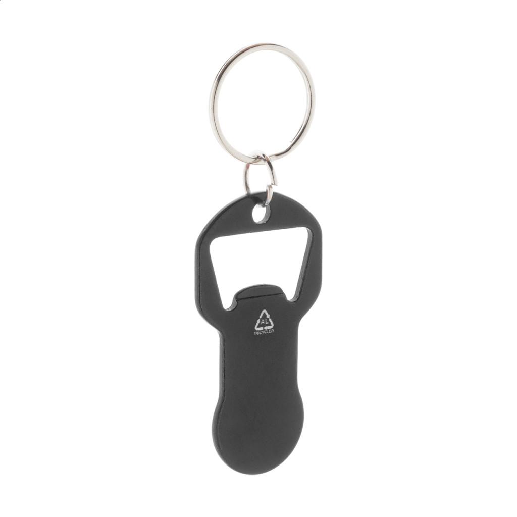 Újrahasznosított alumínium üvegnyitós kulcstartó bevásárlókocsi érmével. Eleje