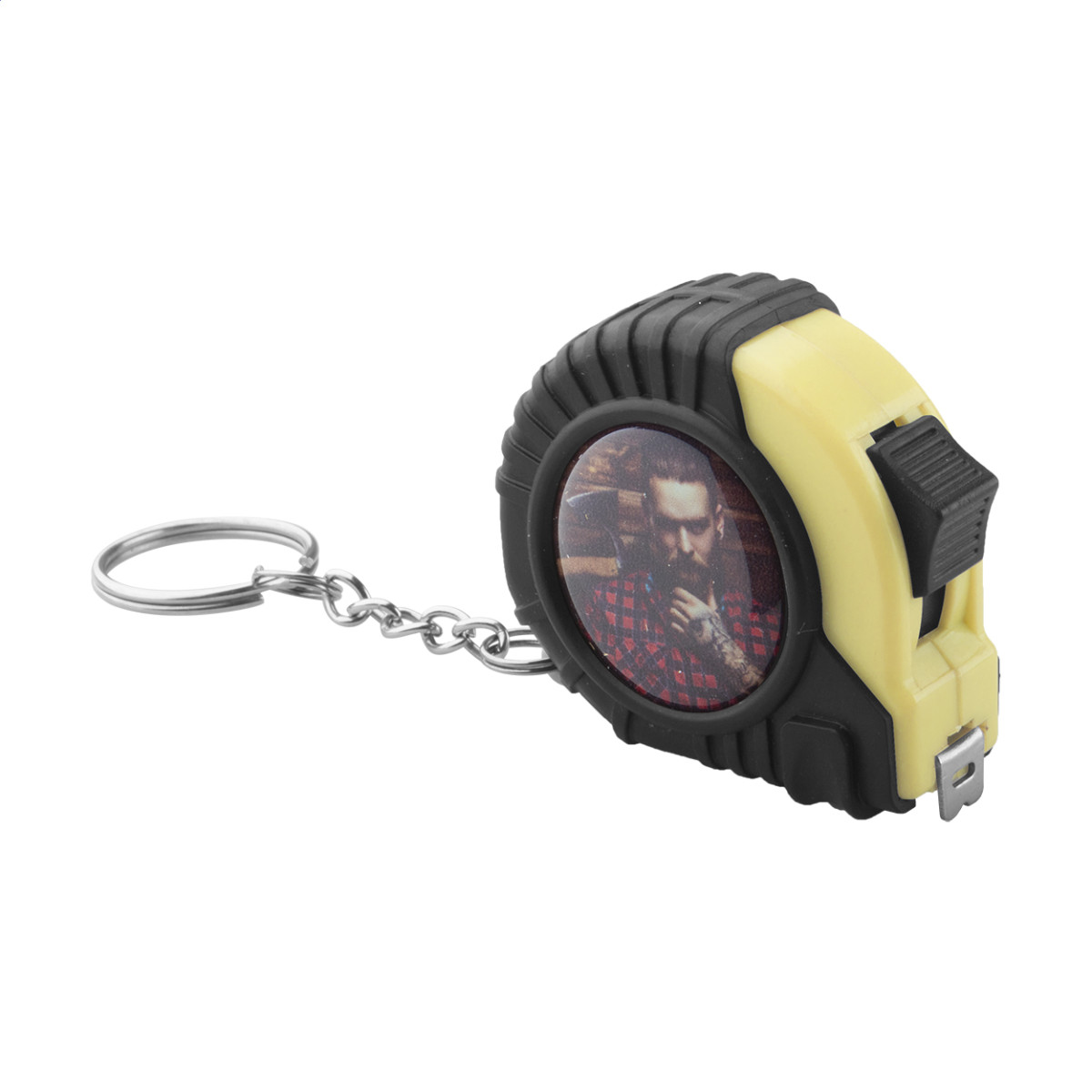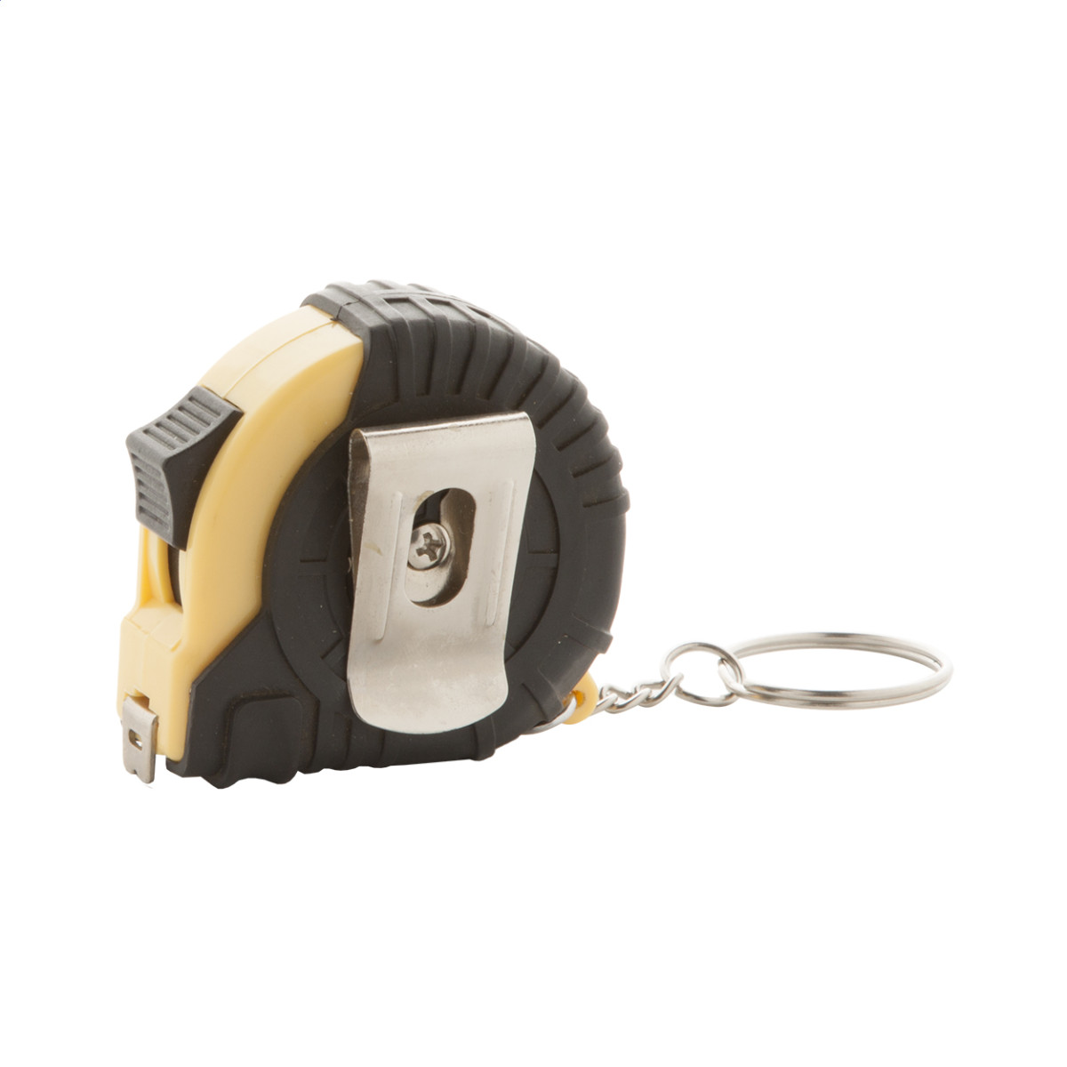 Műanyag mérőszalag fékező funkcióval, fém klipsszel és kulcskarikával, 2 m.