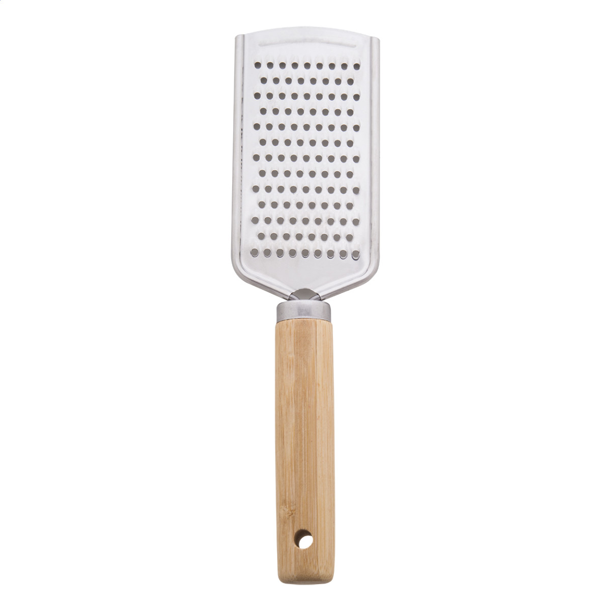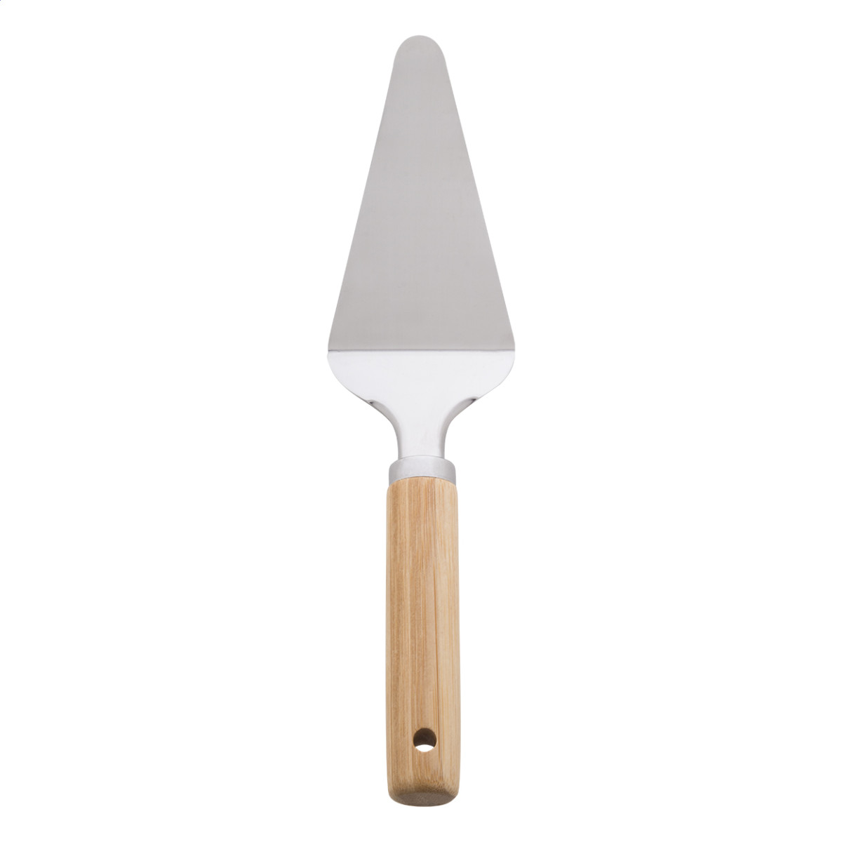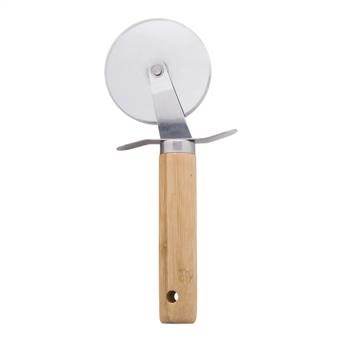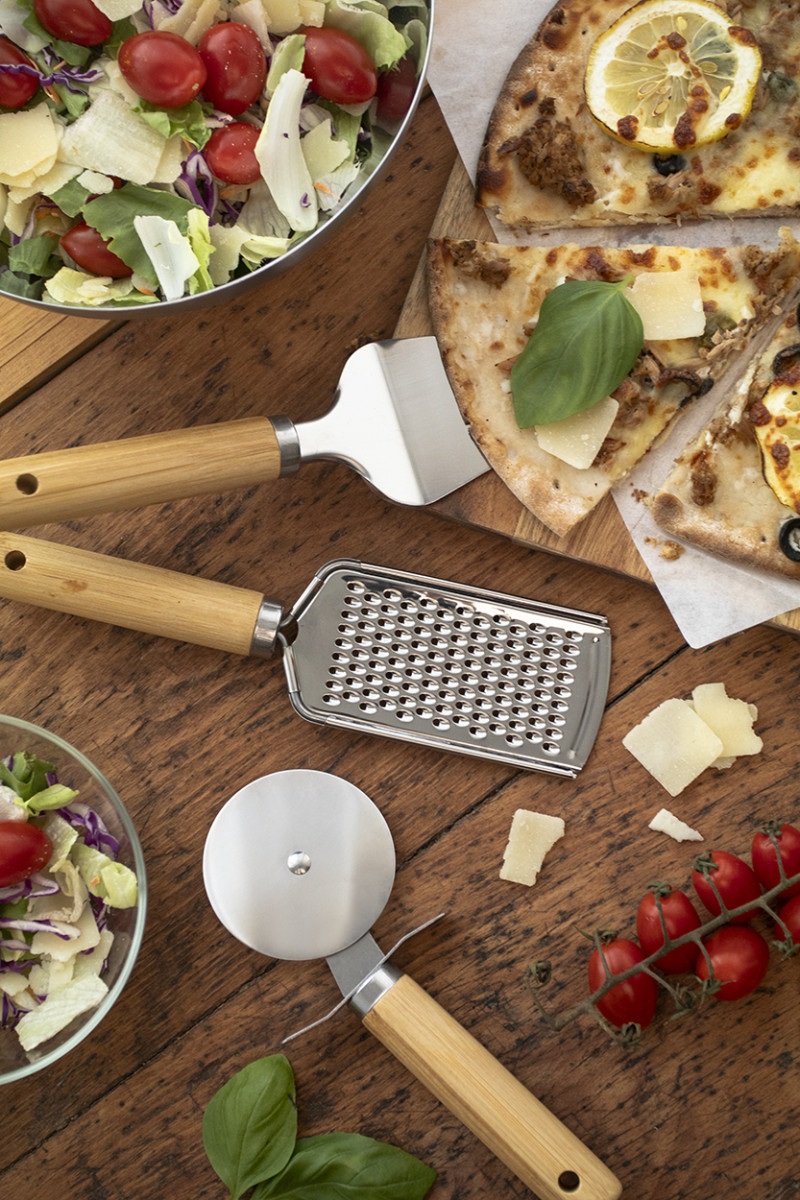 3 db-os, rozsdamentes acél pizza tálaló szett, bambusz fogantyúval, pamut tasakban. Egy sajtreszelőt, pizzavágót és spatulát tartalmaz. Tok