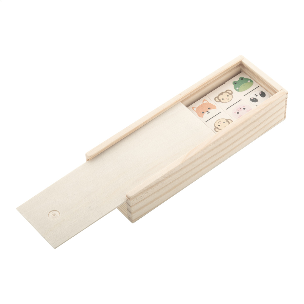 28 db fa dominó tematikus grafikával, fa dobozban. Teteje