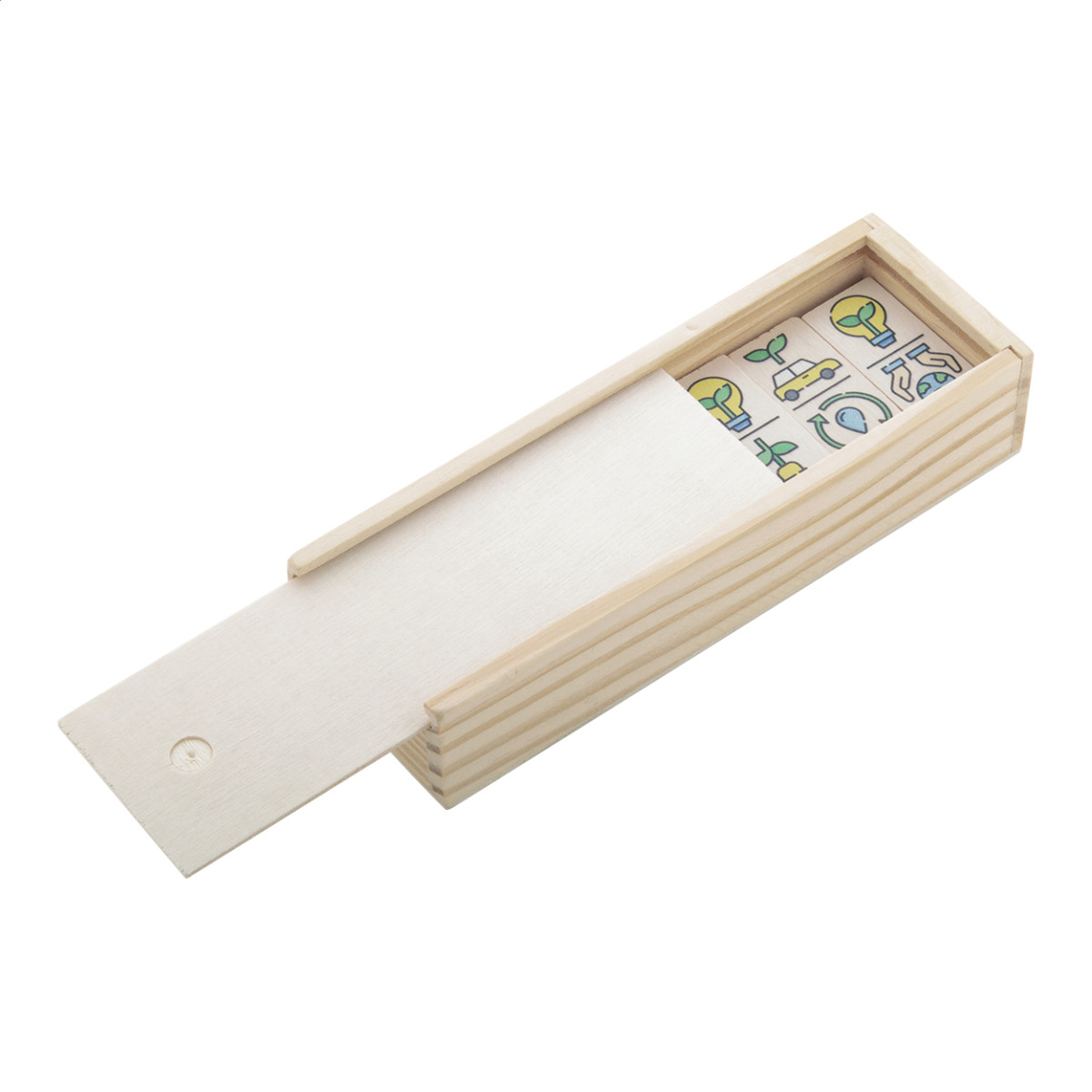 29 db fa dominó tematikus grafikával, fa dobozban. Teteje