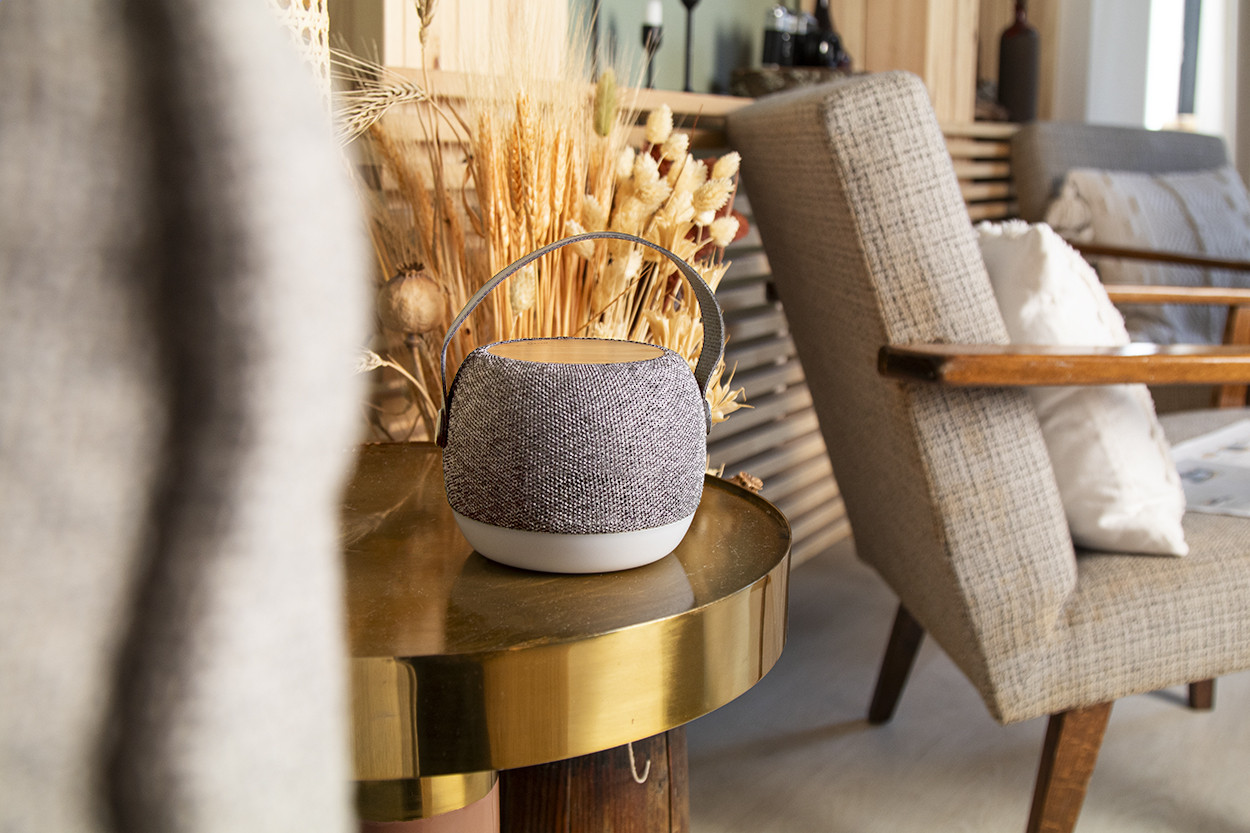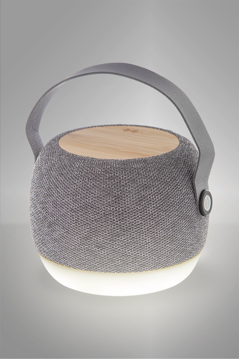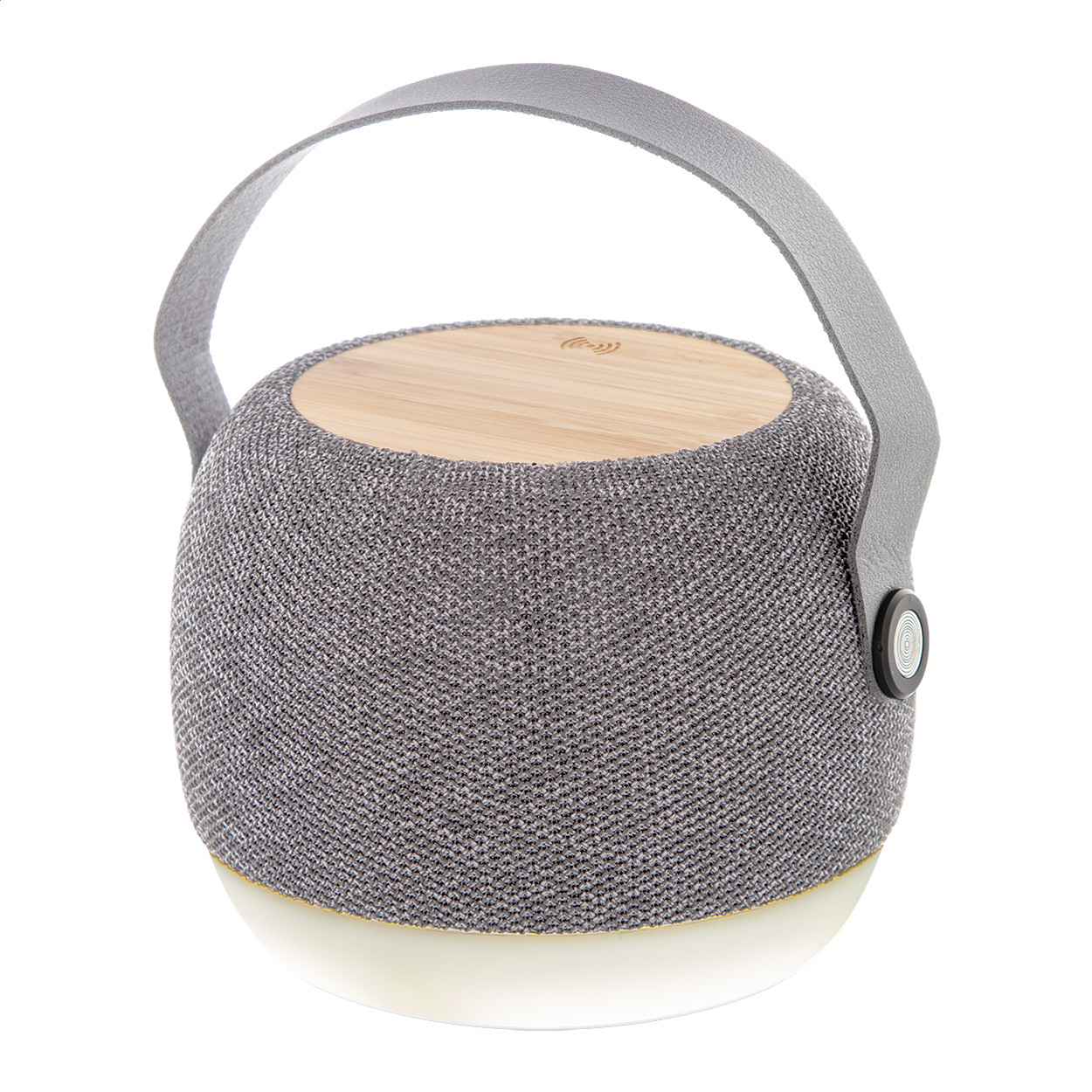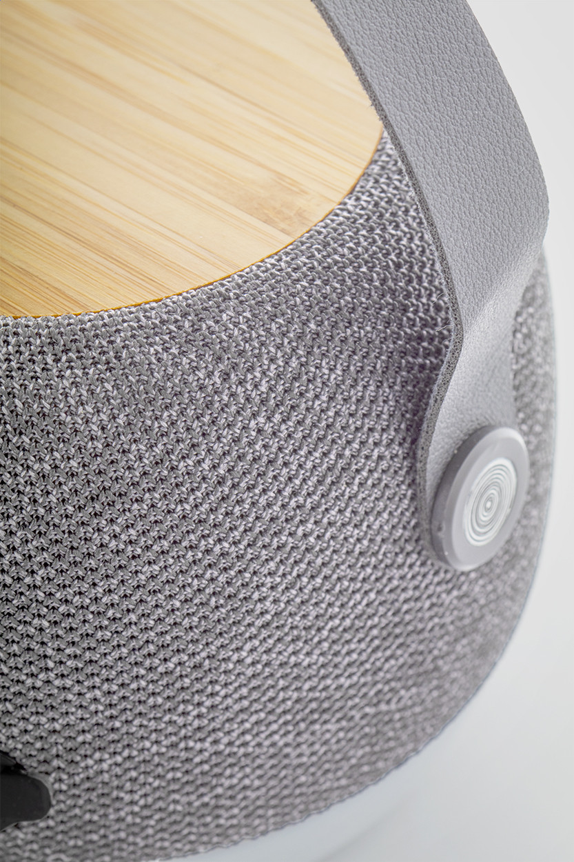 Vezeték nélküli hangszóró RPET szövettel bevont, újrahasznosított ABS műanyag borítással, alul LED lámpával, a tetején bambusz vezeték nélküli gyorstöltővel (15W). PU bőr hordszíjjal, kihangosító funkcióval és beépített újratölthető akkumulátorral (1200 mAh). USB töltőkábellel szállítjuk. |
