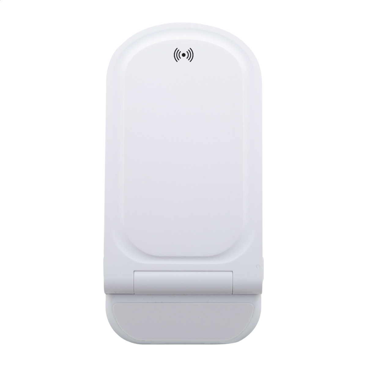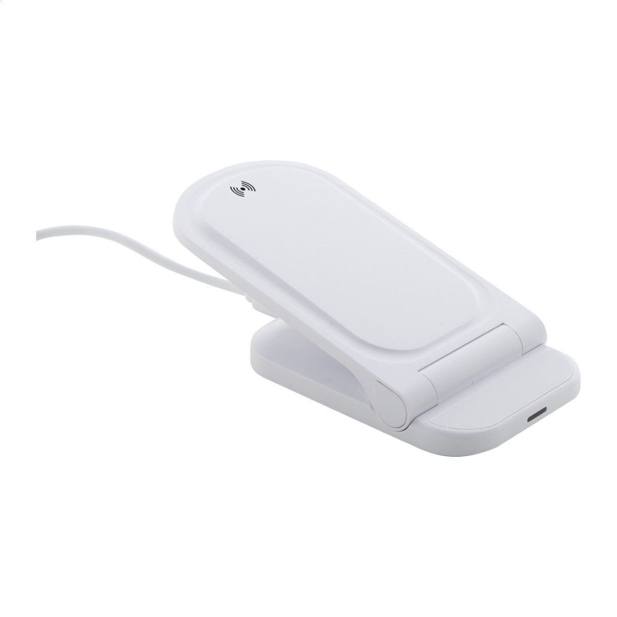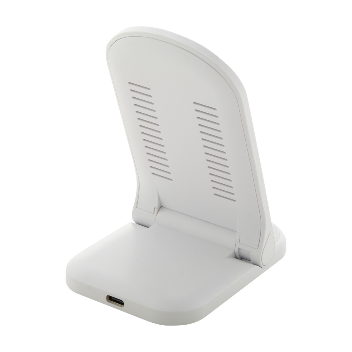 Összecsukható, állítható asztali mobiltartó újrahasznosított ABS műanyagból, beépített vezeték nélküli gyorstöltővel (15W). USB töltőkábellel szállítjuk. Eleje