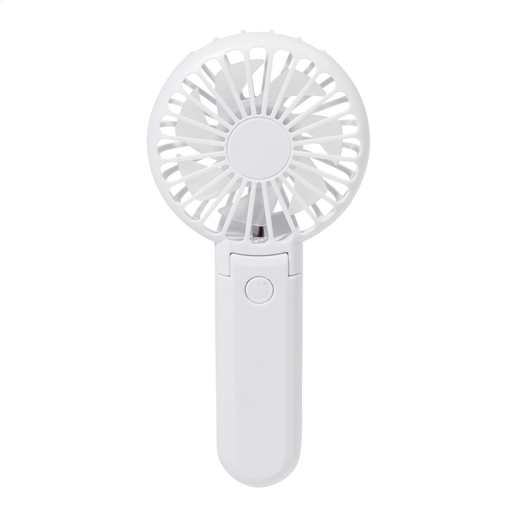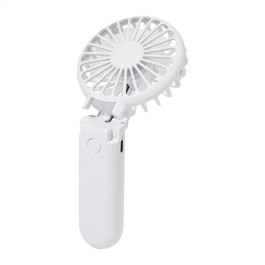 Újrahasznosított ABS elektromos kézi ventilátor beépített USB újratölthető akkumulátorral (400 mAh). Állítható szöggel és 3 sebesség fokozattal. USB töltőkábellel. Eleje