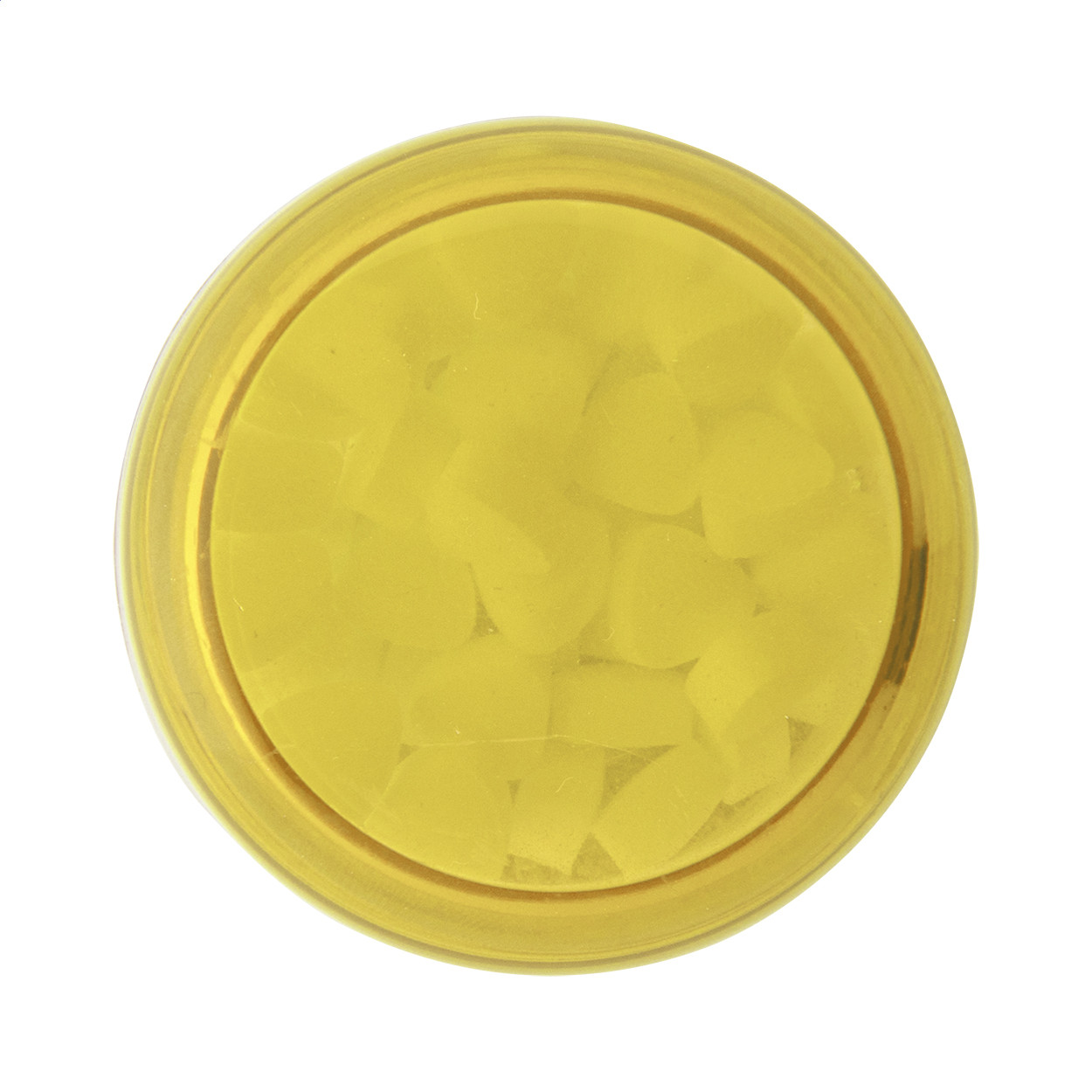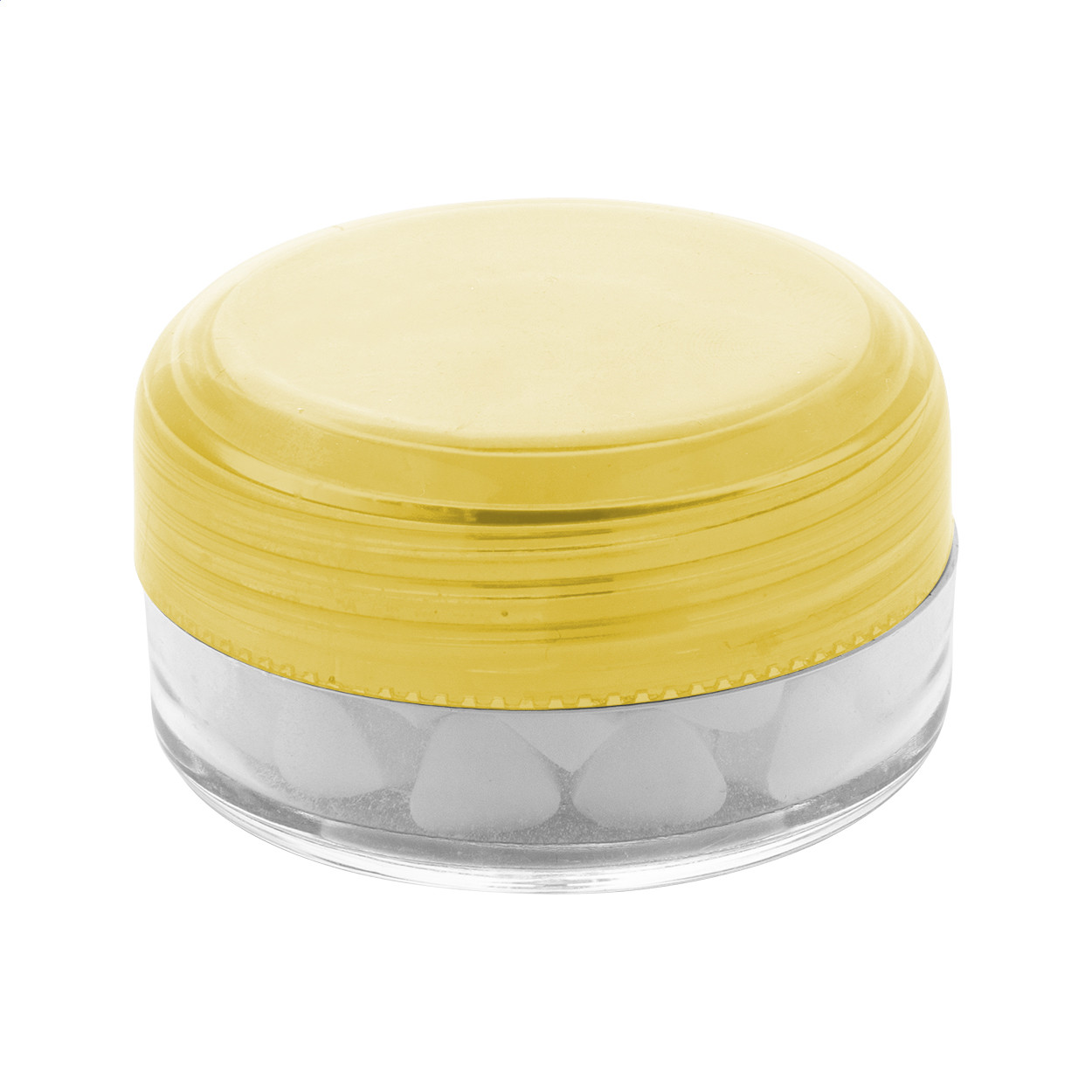 Kerek, átlátszó műanyag cukorkás doboz színes csavaros fedéllel. Kb. 12 gramm cukormentes mentolos cukorkát tartalmaz. Teteje