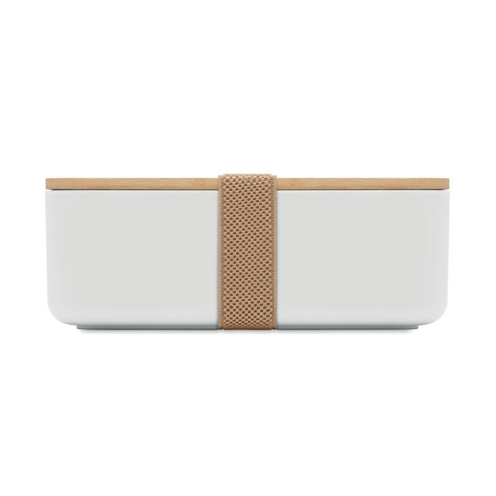 100% kukorica PLA uzsonnás doboz bambuszfedéllel és RPET elasztikus rögzítőpánttal. Űrtartalom: 1000 ml.