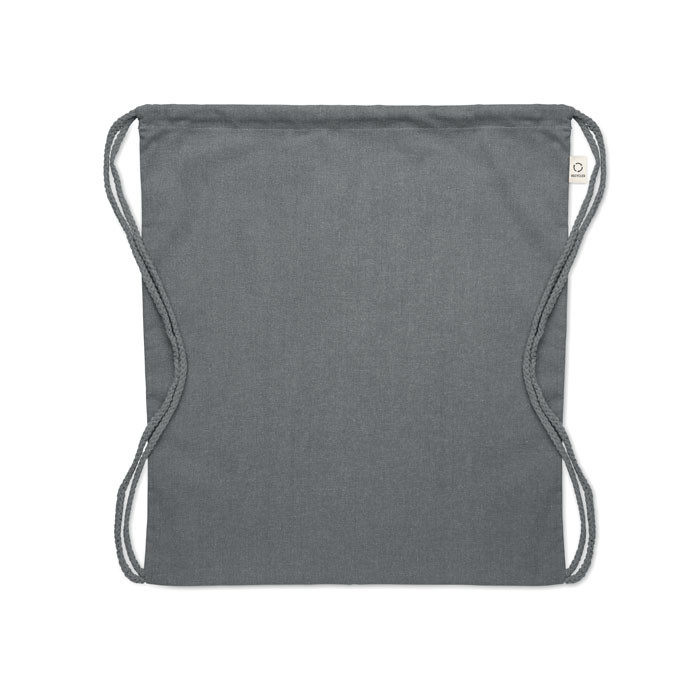 Húzózsinóros táska 30% fogyasztás előtti újrahasznosított pamutból és 30% RPET-ből. 140 g/m². Ez az anyag nyomtatás után zsugorodhat.