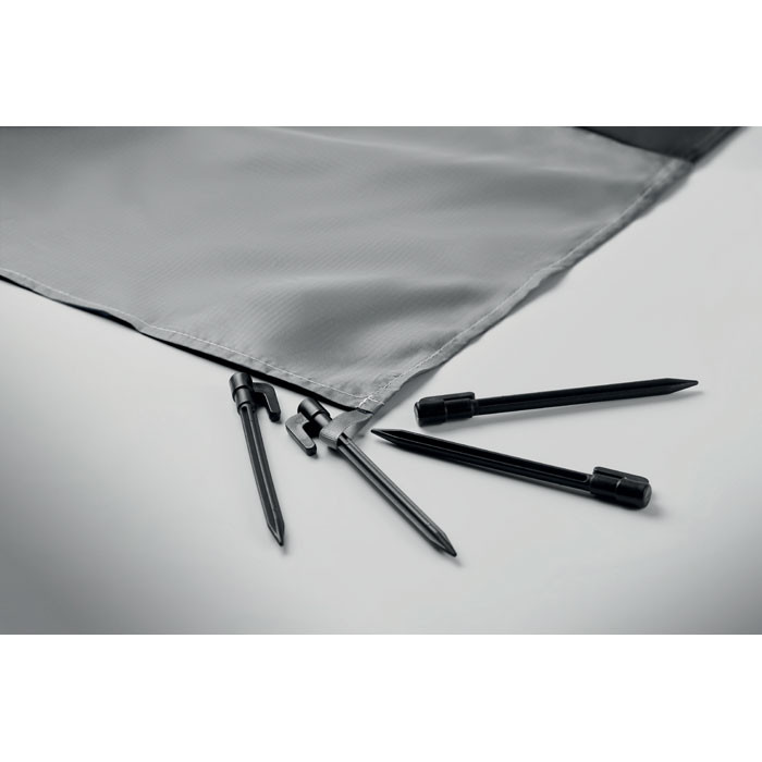 Könnyű, 210T poliészterből készült, 200x210 cm méretű strandszőnyeg. 4 fekete kampóval és hozzá illő, húzózsinóros hordtasakkkal a könnyű szállítás érdekében.