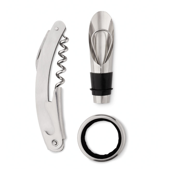 Boros szett borosüveg alakú dobozban. Palack visszazárót, dugóhúzót és cseppfogó gyűrűt tartalmaz. A doboz mágnessel záródik.
