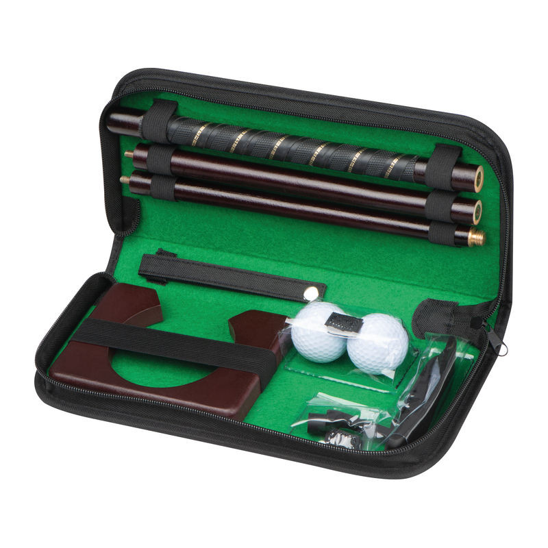 Exkluzív irodai golf készlet fa kiegészítőkkel, beltéri használatra.