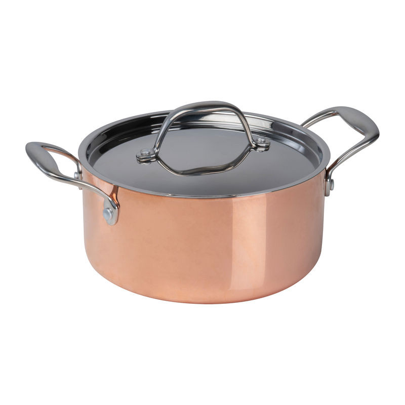 Rozsdamentes acélból készült főzőedény réz bevonattal és fedéllel, két fogantyúval. Alkalmas elektromos, gáz- és indukciós tűzhelyekhez. A réz bevonat biztosítja a legjobb hővezetést és hőtároló képességet.