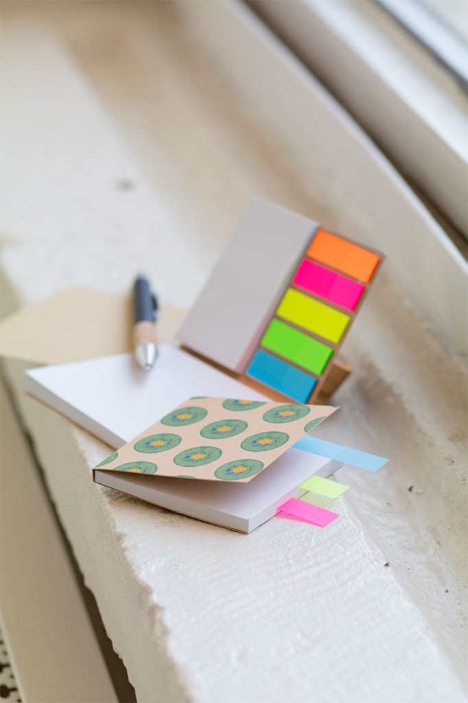 Egyediesíthető, újrahasznosított kraft papírral borított öntapadós jegyzettömb. Tartalmaz újrahasznosított papír öntapadós jegyzetlapokat 2 méretben (50 lap 100×75 mm és 25 lap 50×75 mm) és 100 műanyag fólia oldaljelölőt 5 különböző színben (44×12 mm). Az ár tartalmazza a külső borító full-colour nyomtatását. Minimális rendelési mennyiség: 100 db. |