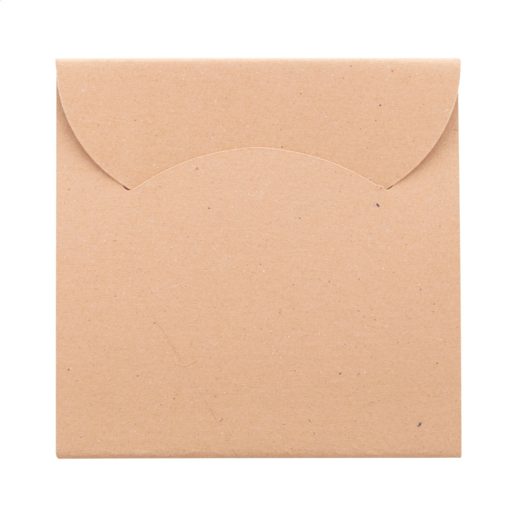 Egyediesíthető, újrahasznosított kraft papírral borított öntapadós jegyzettömb. Tartalmaz 50 újrahasznosított papír öntapadós jegyzetlapot (75×75 mm) és 100 műanyag fólia oldaljelölőt 5 különböző színben (44×12 mm). Az ár tartalmazza a külső borító full-colour nyomtatását. Minimális rendelési mennyiség: 100 db. |