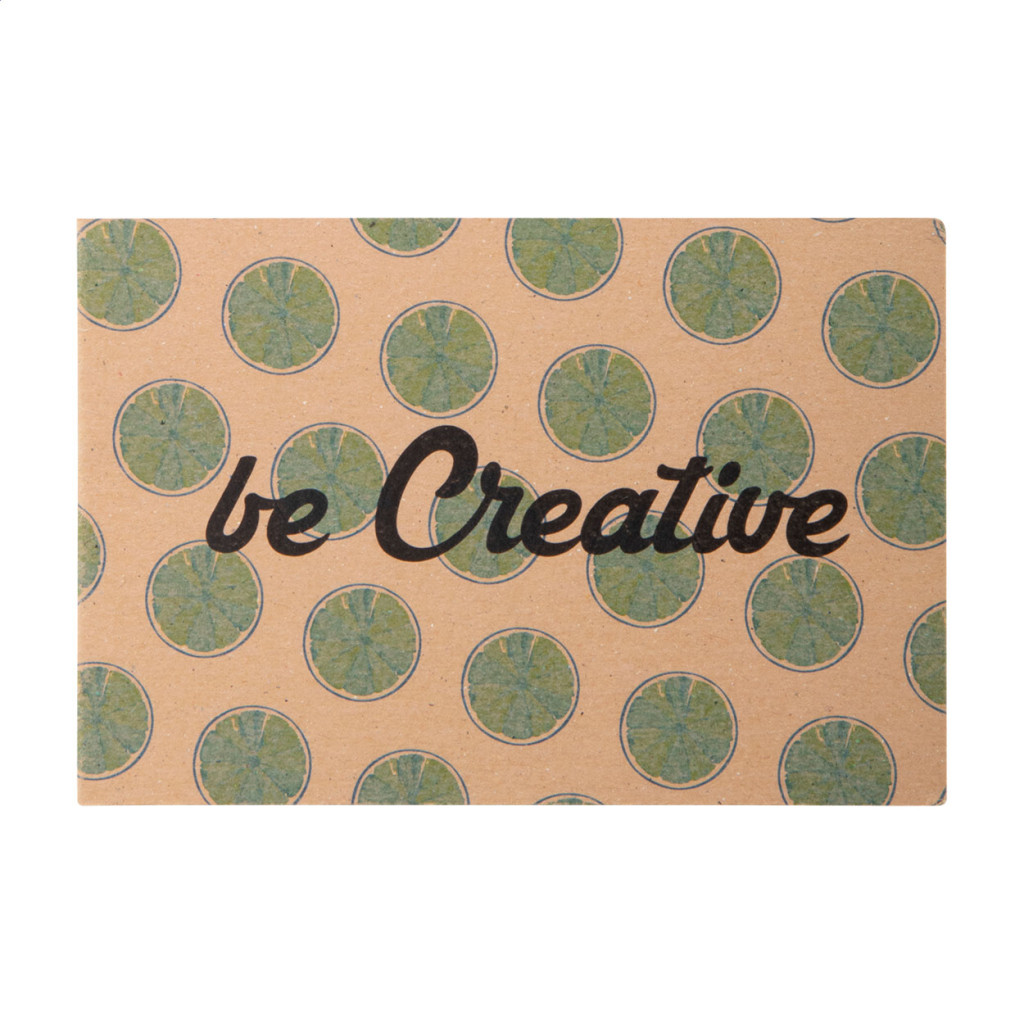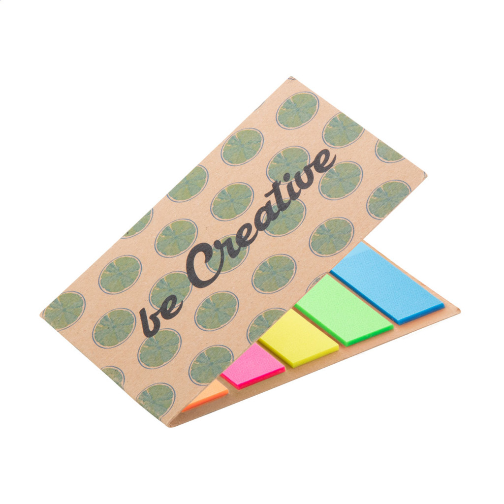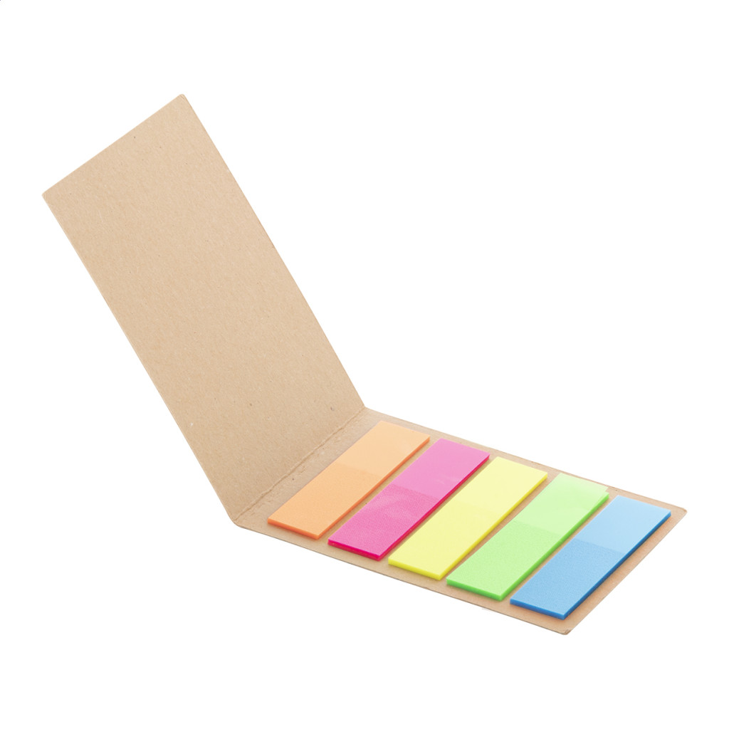 Egyediesíthető, újrahasznosított kraft papírral borított öntapadós jegyzettömb. Tartalmaz 100 műanyag fólia oldaljelölőt 5 különböző színben (44×12 mm). Az ár tartalmazza a külső borító full-colour nyomtatását. Minimális rendelési mennyiség: 100 db. Külső borító