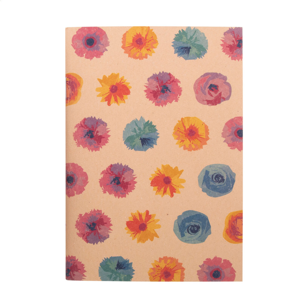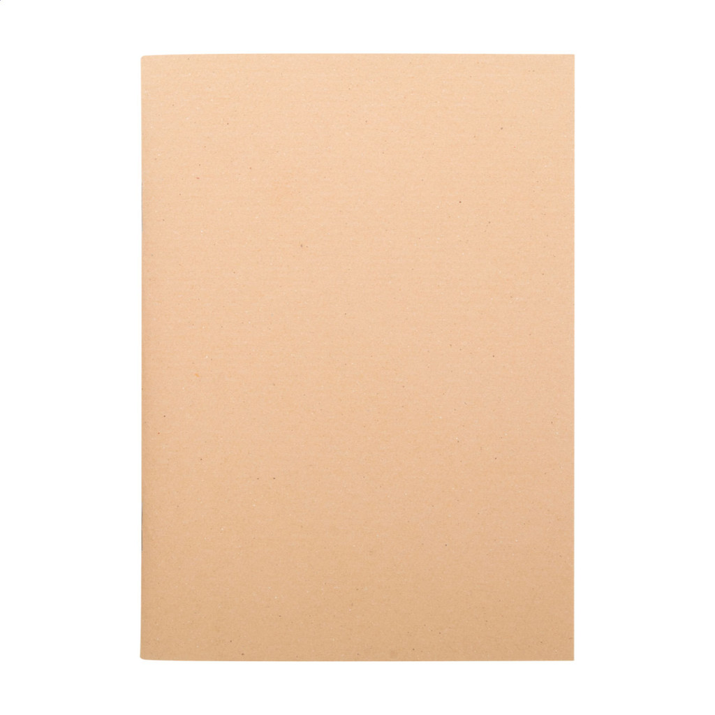 Egyediesíthető, A6 méretű jegyzetfüzett újrahasznosított kraft papír borítóval, 32 újrahasznosított papírlappal. Az ár tartalmazza a borító full colour emblémázását és egy további mintát minden belső oldalon. Minimális rendelési mennyiség: 100 db. Első borító