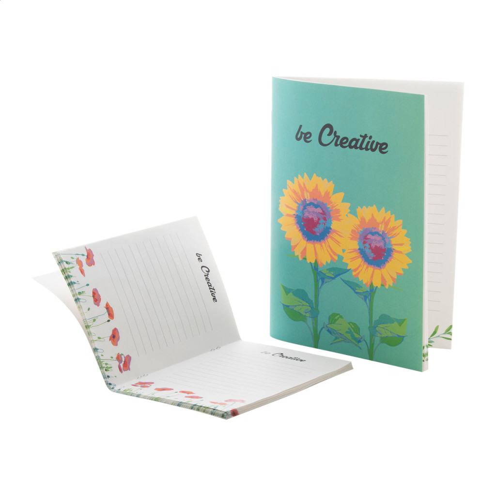 Egyediesíthető, A5 méretű jegyzetfüzett újrahasznosított papír borítóval, 32 újrahasznosított papírlappal. Az ár tartalmazza a borító full colour emblémázását és egy további mintát minden belső oldalon. Minimális rendelési mennyiség: 100 db. Külső borító