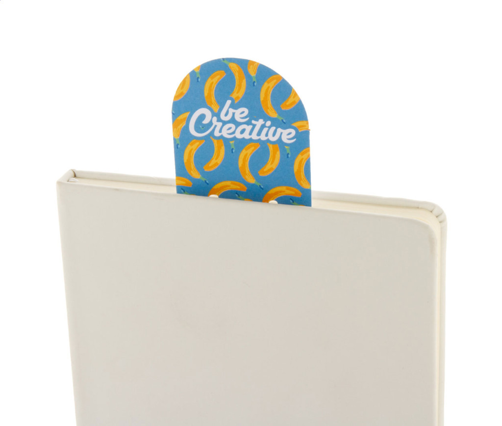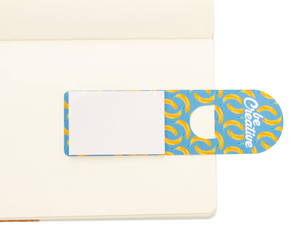 Egyediesíthető papír könyvjelző öntapadó lapokkal. 25 db újrahasznosított papírból készült öntapadó lapot tartalmaz (50×75 mm). Az ár tartalmazza a full colour nyomtatást a termék elülső oldalán. Minimális rendelési mennyiség: 100 db. Eleje