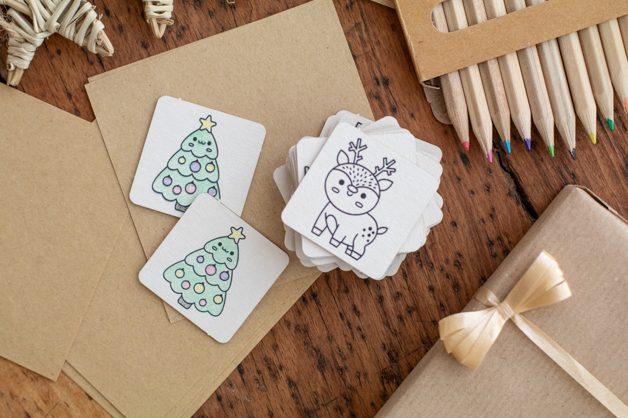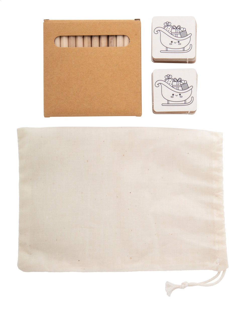 Karácsonyi színező memóriajáték pamut zsinóros tasakban. Karácsonyi motívumokkal ellátott karton memóriajátékot (24 lapka) és 12 db papírdobozban lévő fa színesceruzát tartalmaz. Tok eleje