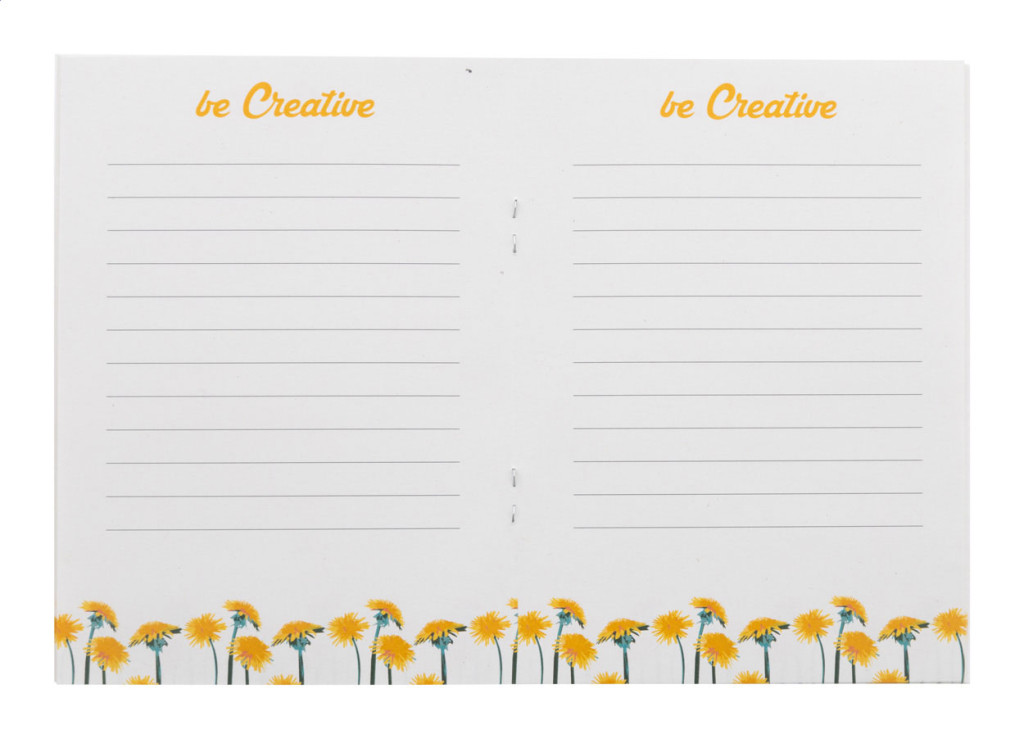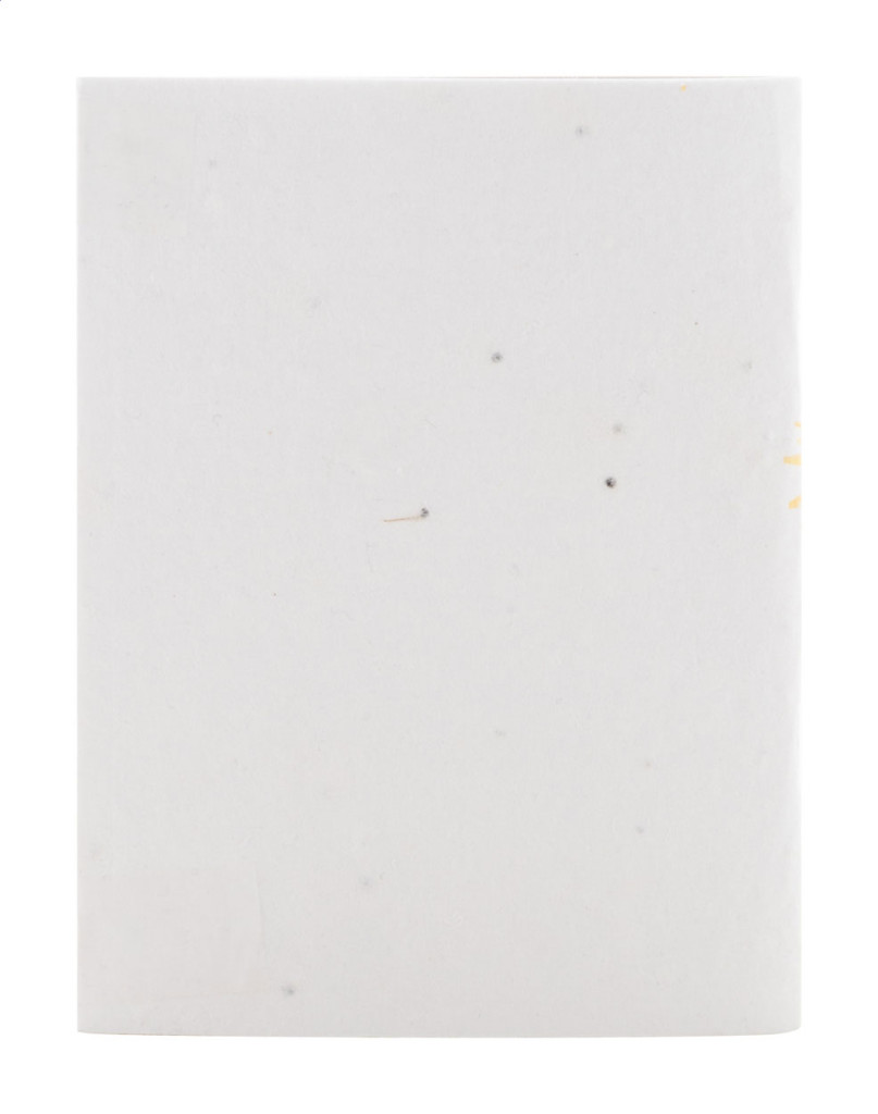 Egyedi gyártású, magpapírral borított jegyzetfüzet 32 újrahasznosított papírlappal, A6 méretű. Az ár tartalmazza a full-colour nyomtatott külső borítót és a belső oldalak azonos full-colour nyomtatását. Minimális rendelési mennyiség: 100 db. Válogatott vadvirág magvakkal. Első borító