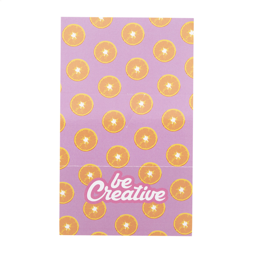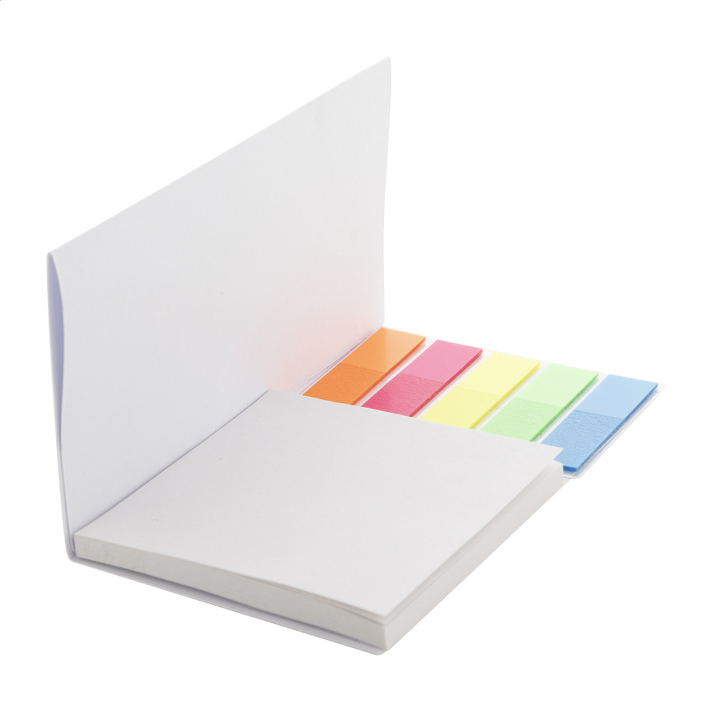 Egyedi gyártású papír jegyzetadagoló függőleges fejléccel. 50 újrahasznosított papírból készült cetlit (75×75 mm) és 100 műanyag oldaljelölőt tartalmaz, 5 különböző színben (44×12 mm). Az ár tartalmazza a teljes színes nyomtatást a fejlécre. Minimális rendelési mennyiség: 100 db. |