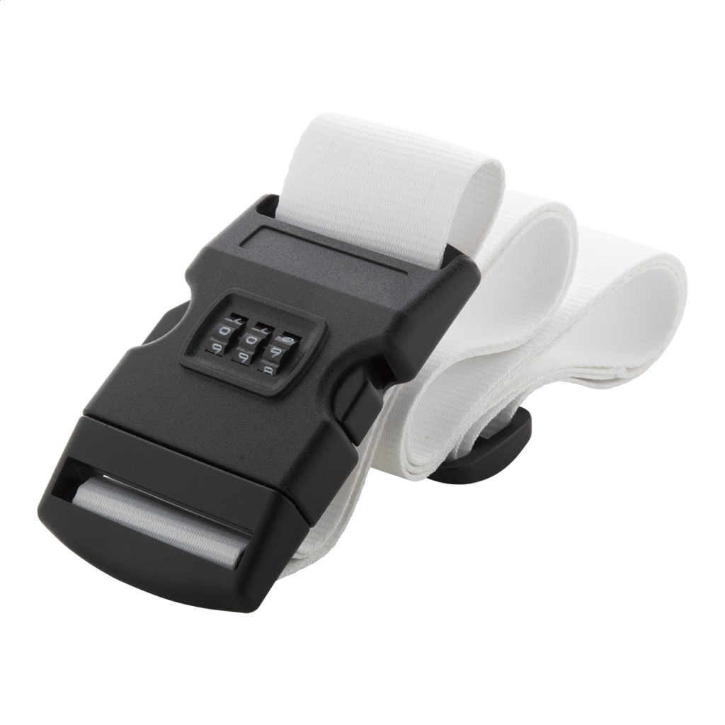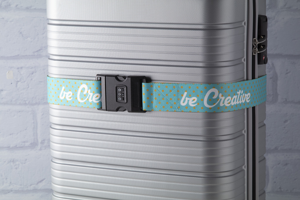 Egyedi gyártású, poliészter bőrönd heveder állítható pánttal és 3 számjegyű kóddal zárható lakattal. Mindkét oldalán szublimációs technológiával emblémázva. Minimális rendelési mennyiség: 50 db. Eleje