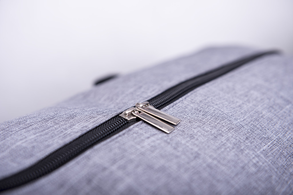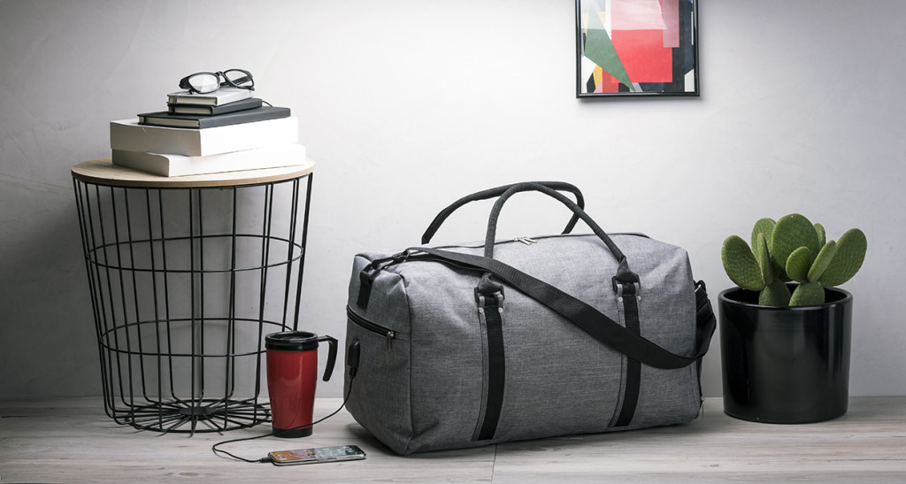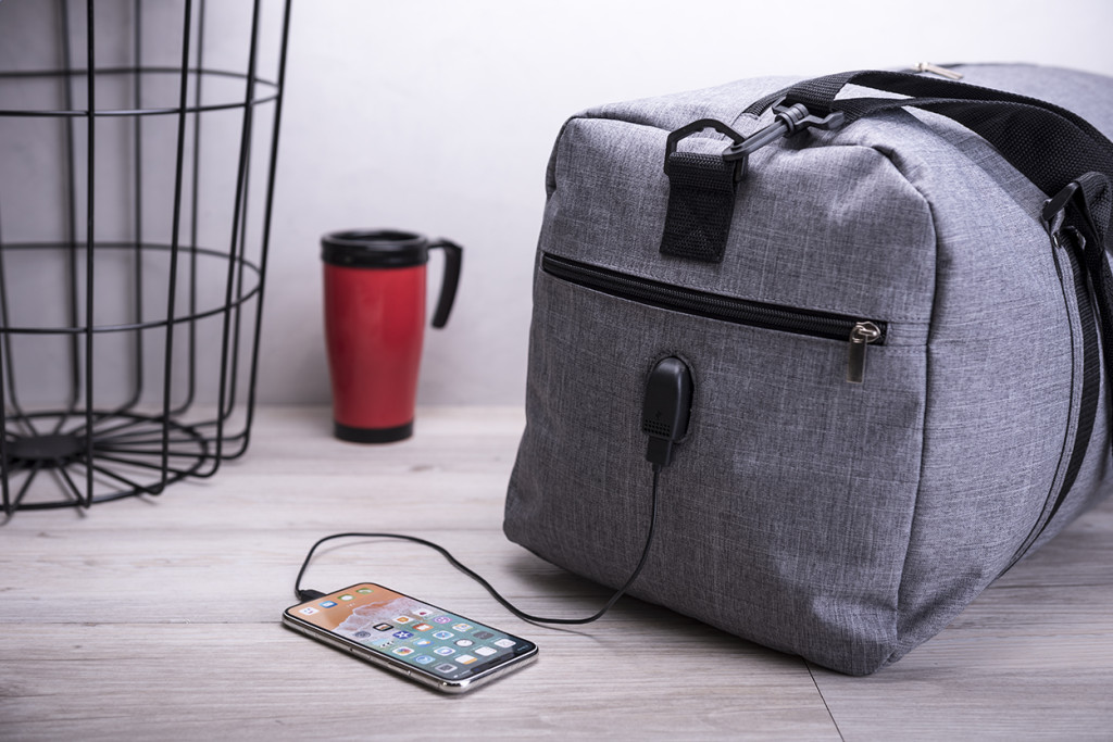 Sporttáska cipzáras zsebbel, vállpánttal és beépített USB csatlakozóval power bankhoz. 600D poliészter. Eleje