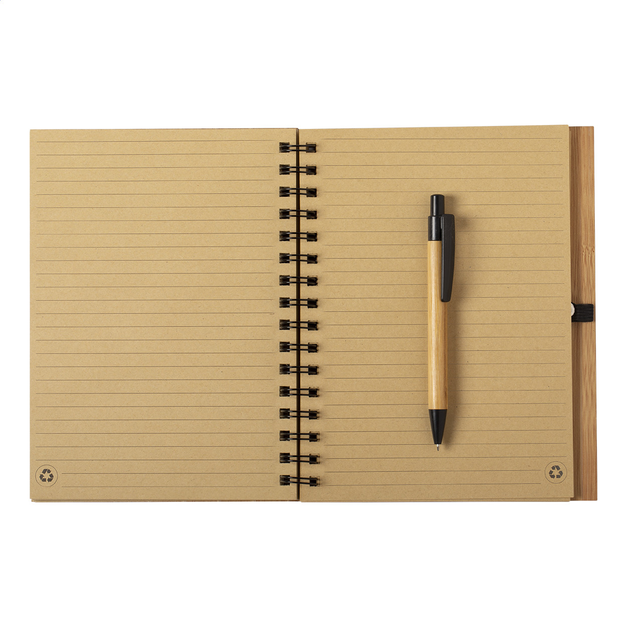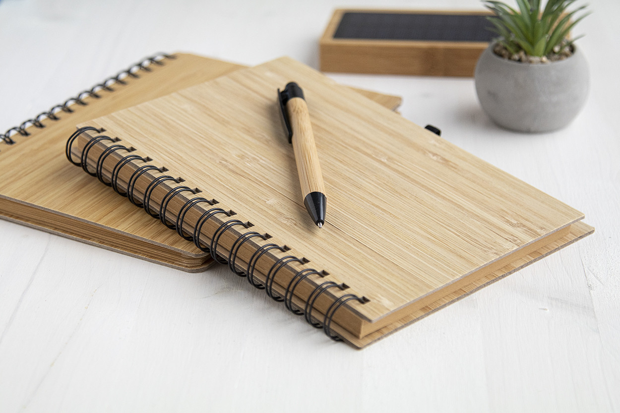Bambusz borítású spirál jegyzetfüzet 80 db vonalas A5 méretű lapokkal. Tartalmaz egy bambusz golyóstollat fekete tollbetéttel. Eleje