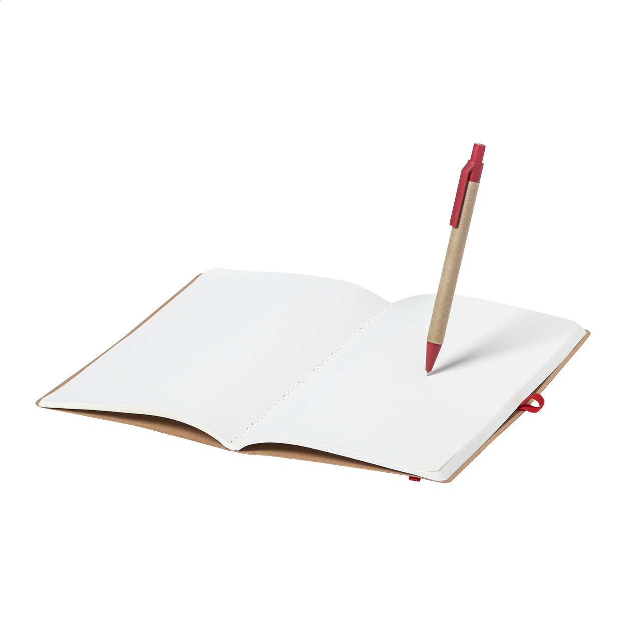 Újrahasznosított karton borítású jegyzetfüzet 60 sima lappal és színes gumipánttal, A5 méretű. Búzaszalma műanyag golyóstollal, kék tollbetéttel. Eleje