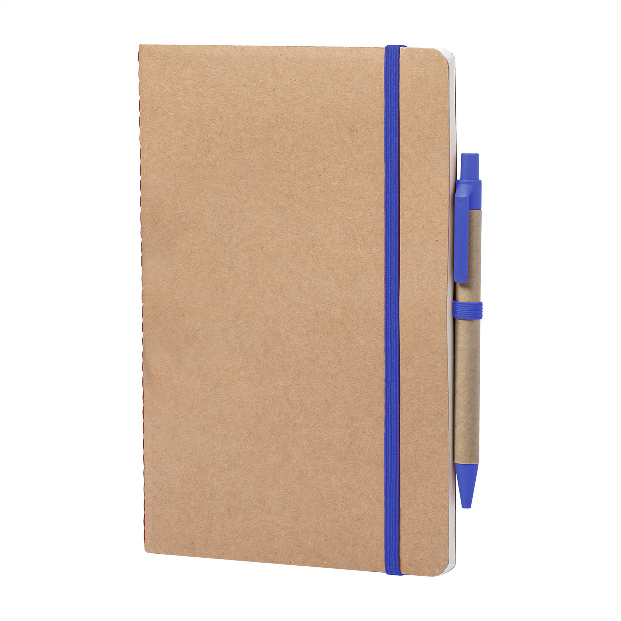 Újrahasznosított karton borítású jegyzetfüzet 60 sima lappal és színes gumipánttal, A5 méretű. Búzaszalma műanyag golyóstollal, kék tollbetéttel. Eleje