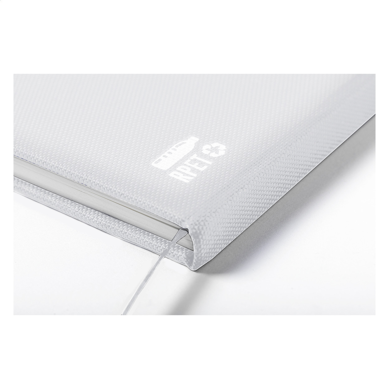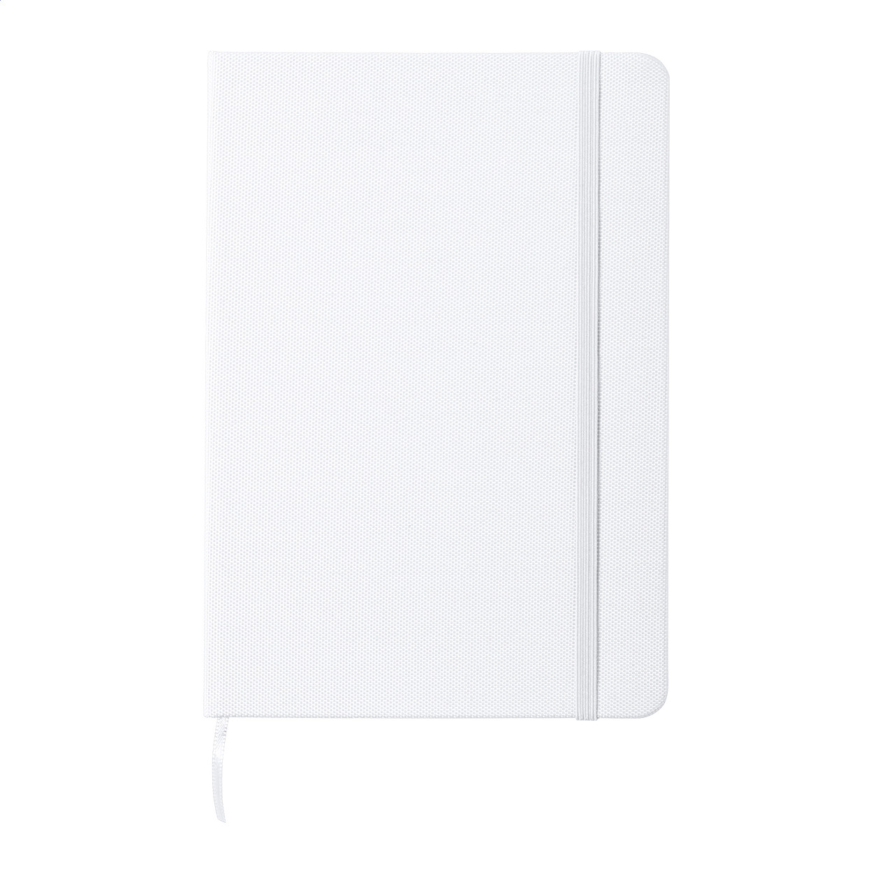 RPET poliészter borítású jegyzetfüzet 80 vonalas lappal, könyvjelzővel és gumipánttal. Méret: A5. Első borító