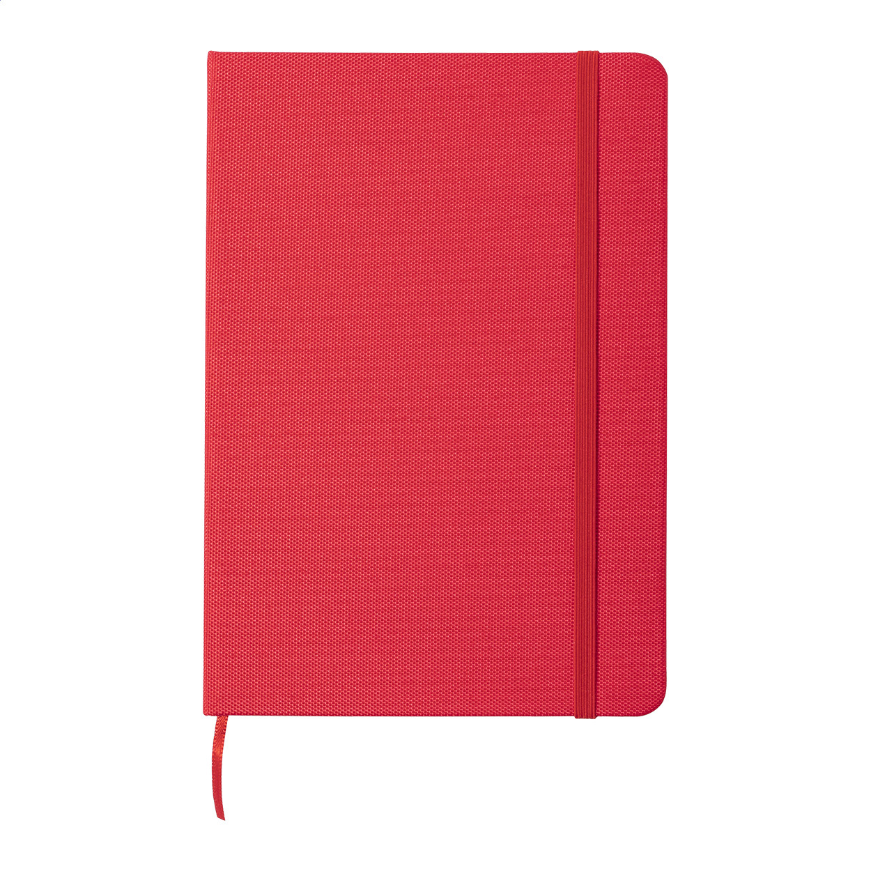 RPET poliészter borítású jegyzetfüzet 80 vonalas lappal, könyvjelzővel és gumipánttal. Méret: A5. Első borító